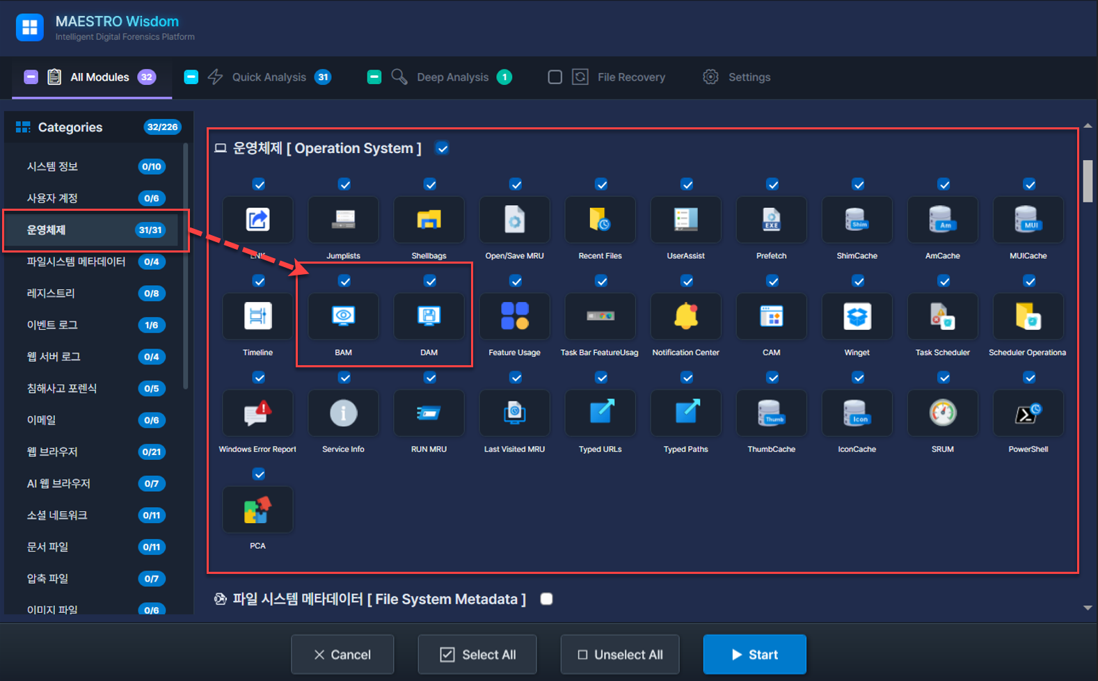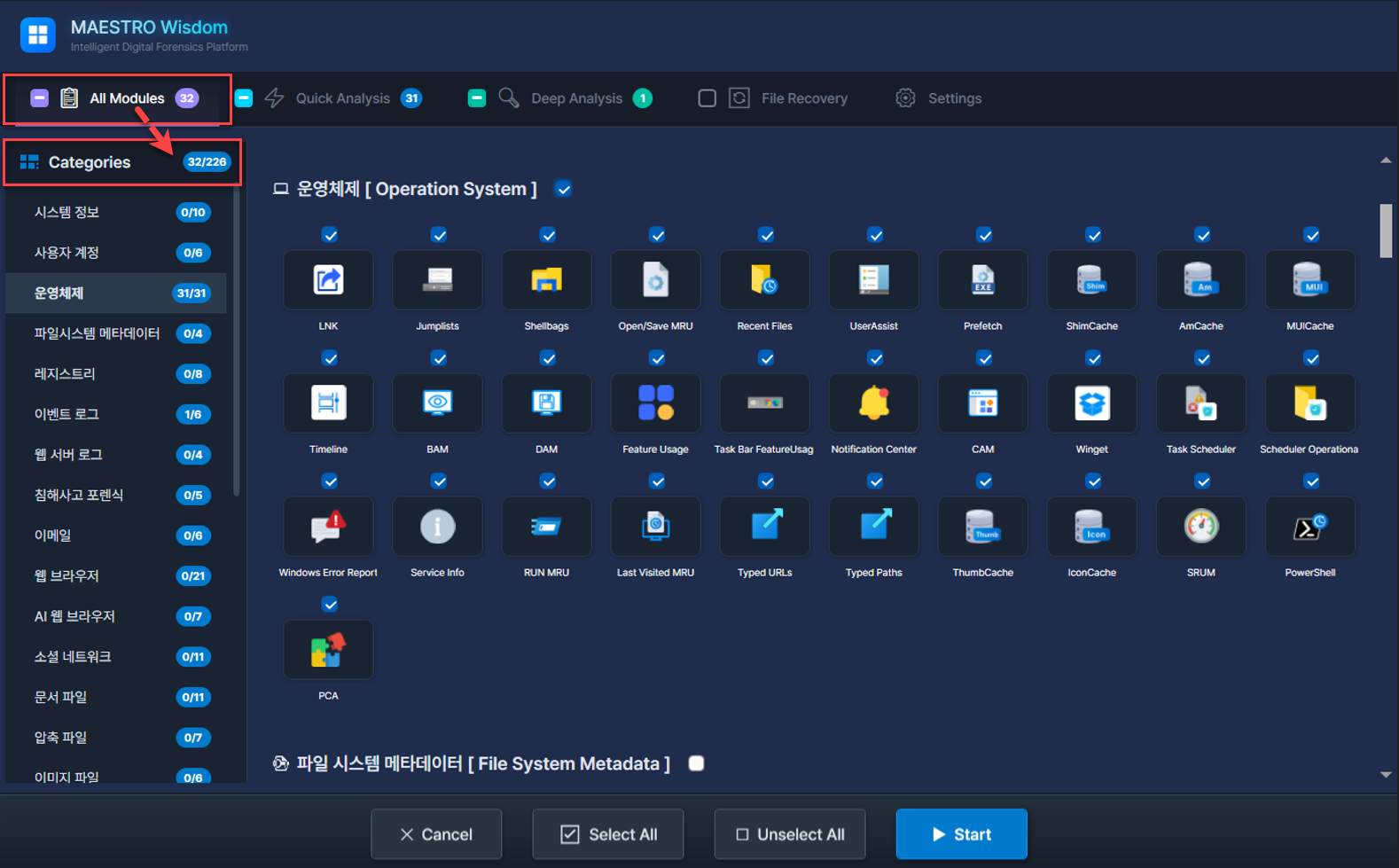 WiSDOM Windows에서 제공하는 220개 이 아티팩트(Artifacts) 선택