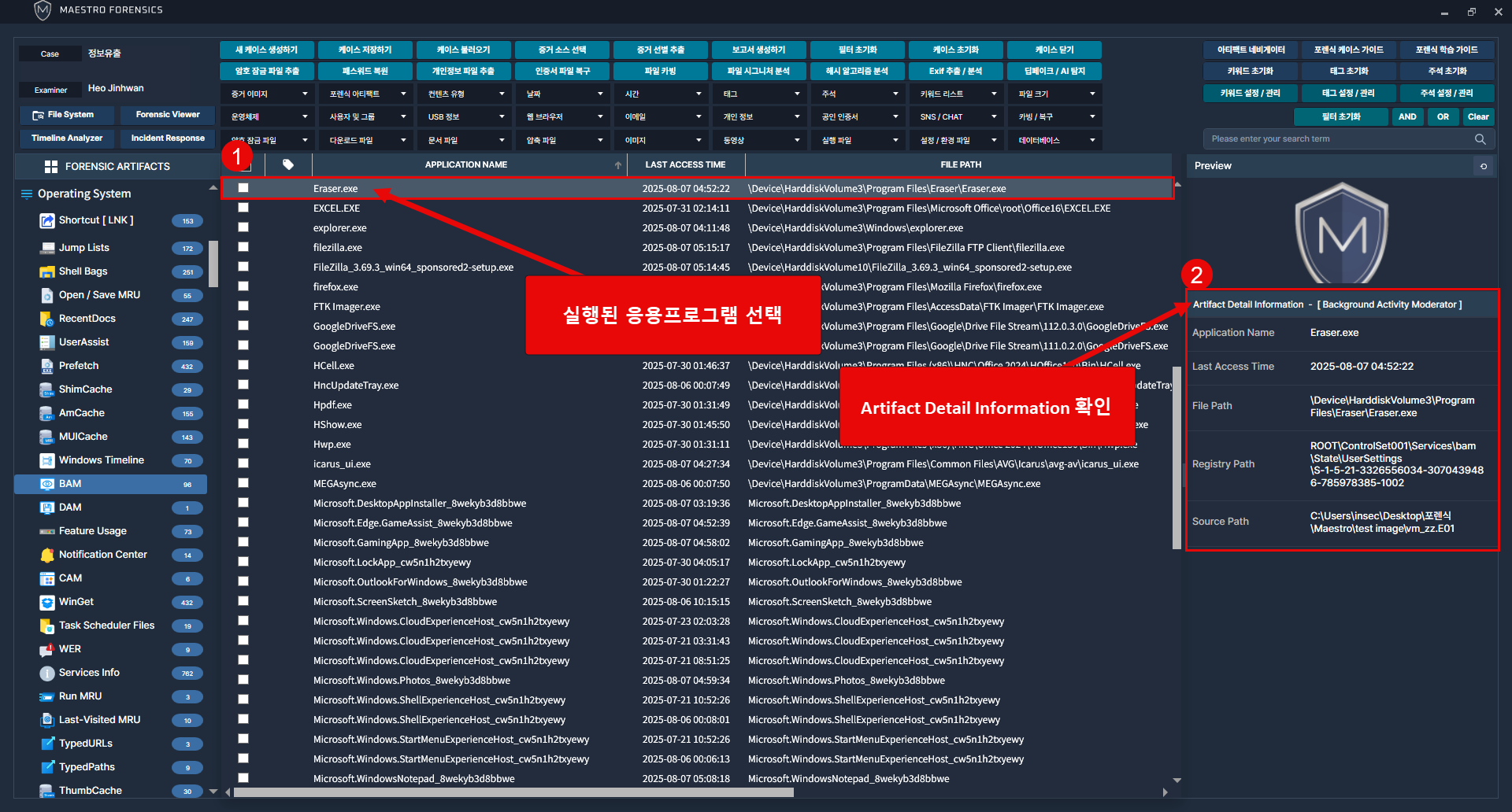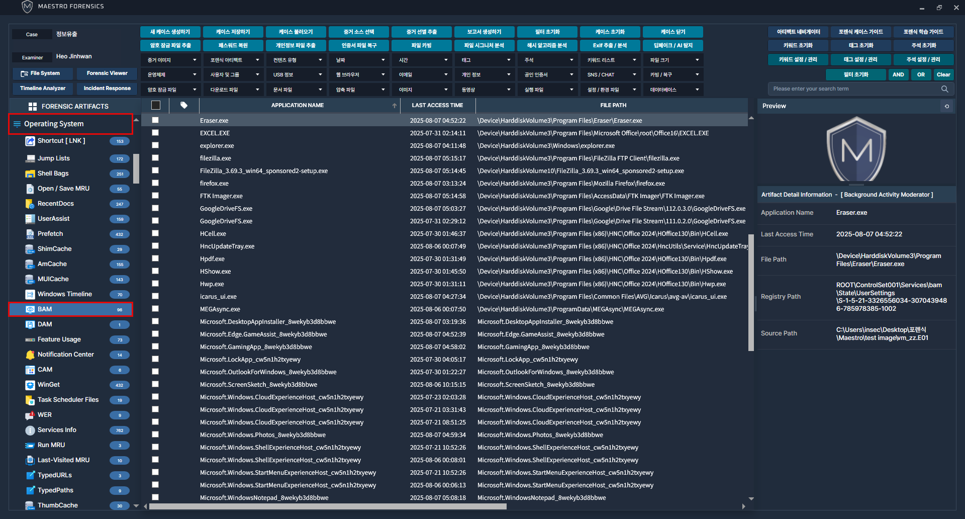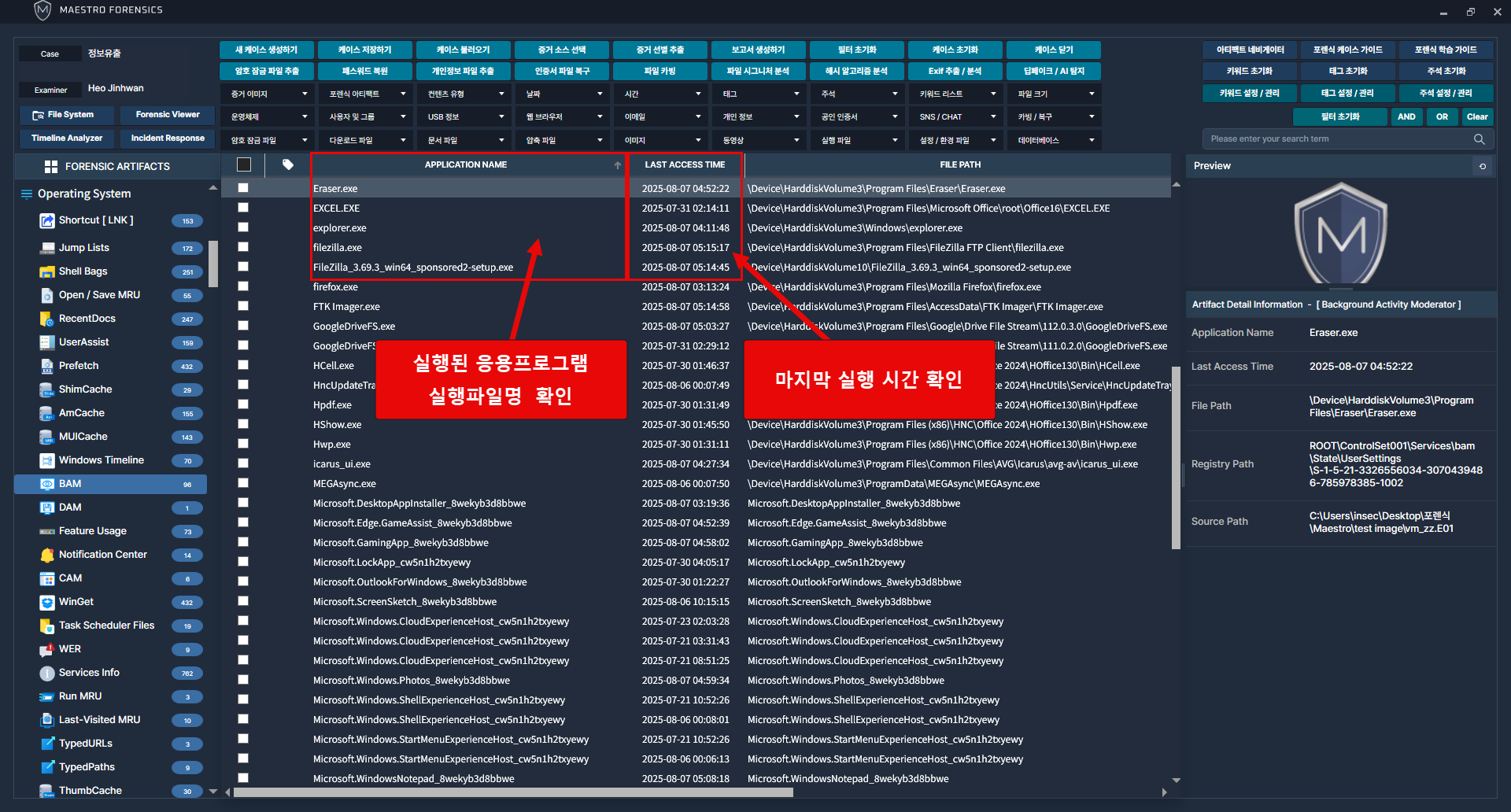BAM 아티팩트 레지스트리 경로에 이동하면 사용자 SID 별 서브키가 생성되어 있으며 실행 된 응용 프로그램 경로 확인 가능
