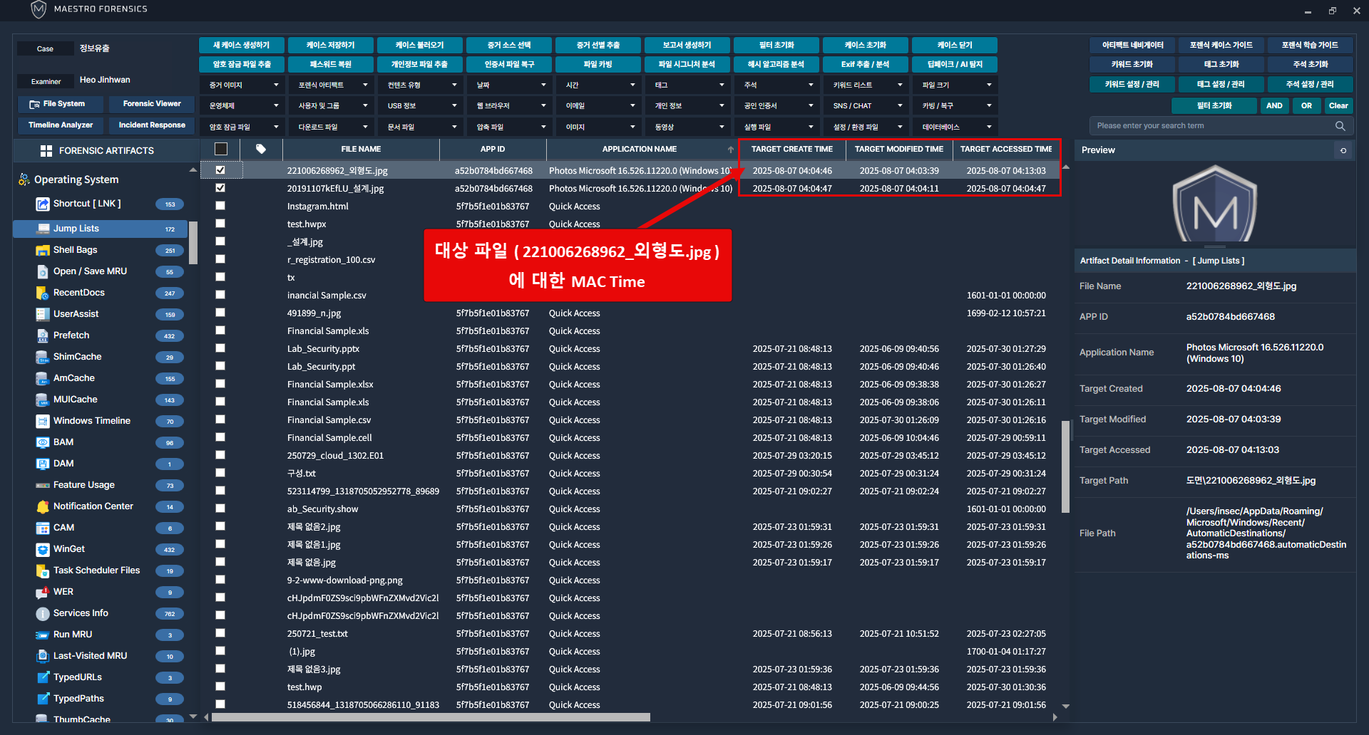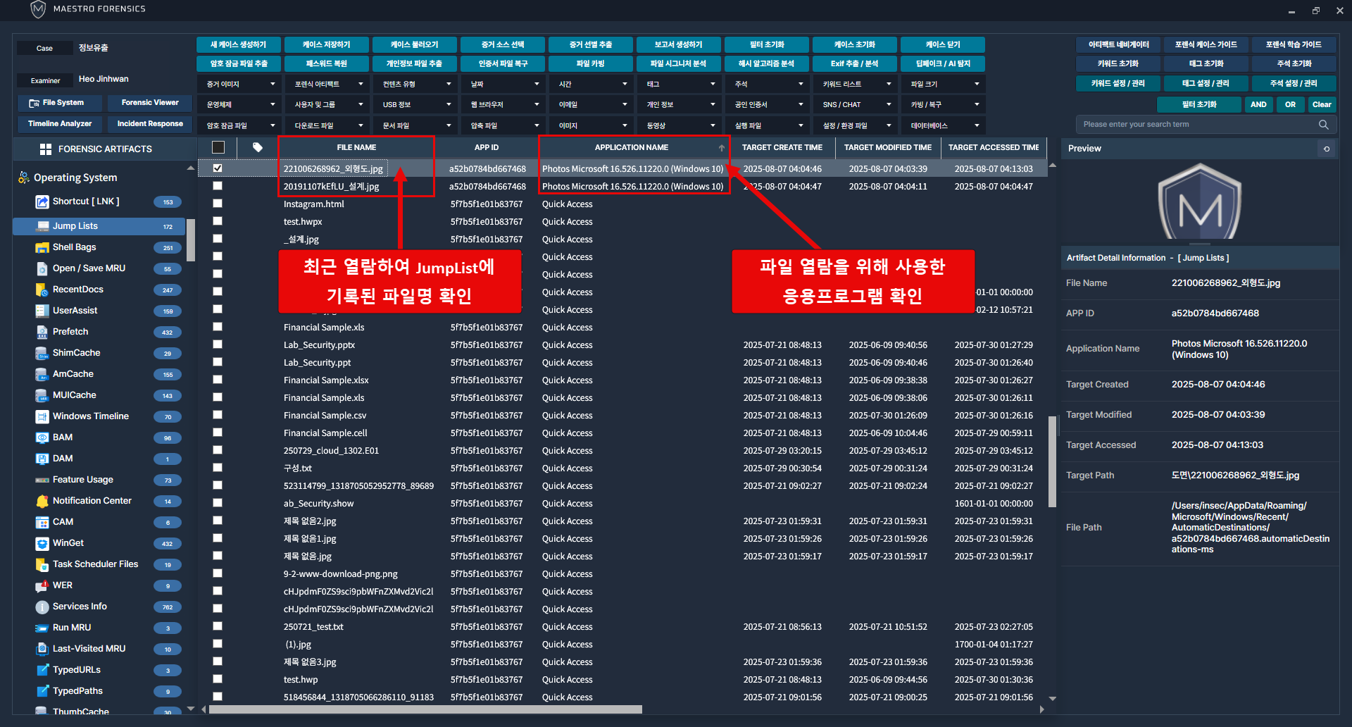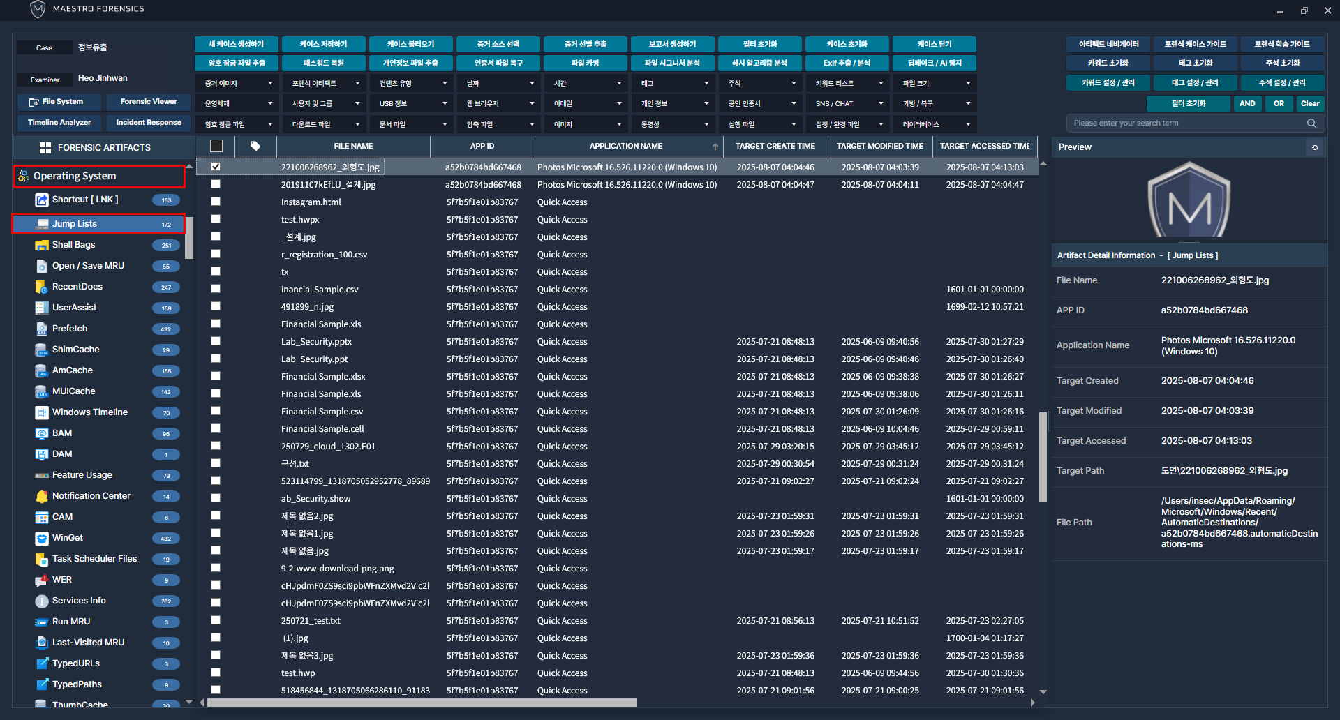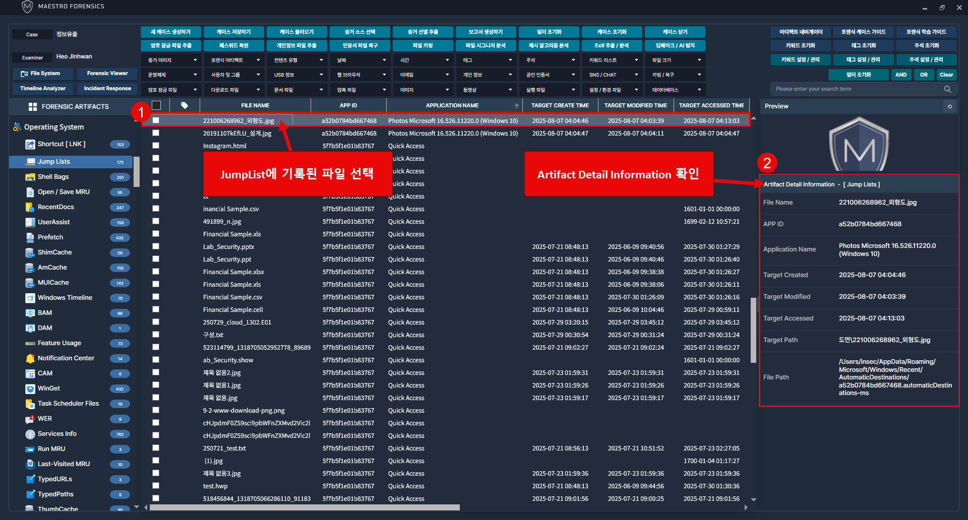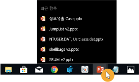 좌측 운영체제 카테고리에서 점프목록 아티팩트 클릭
