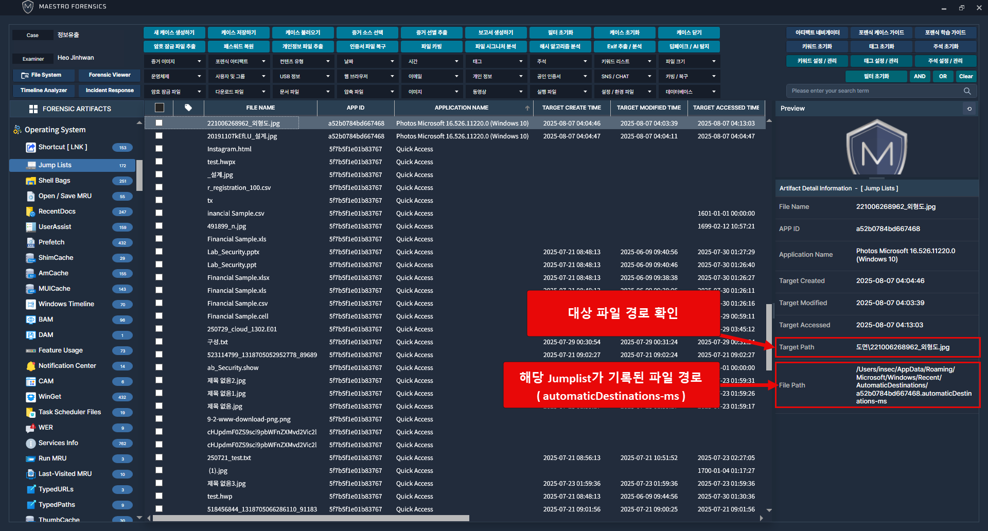 [세부 정보]테이블의 [증거 정보]- [소스]를 통해서 JumpList 경로 확인 가능하고