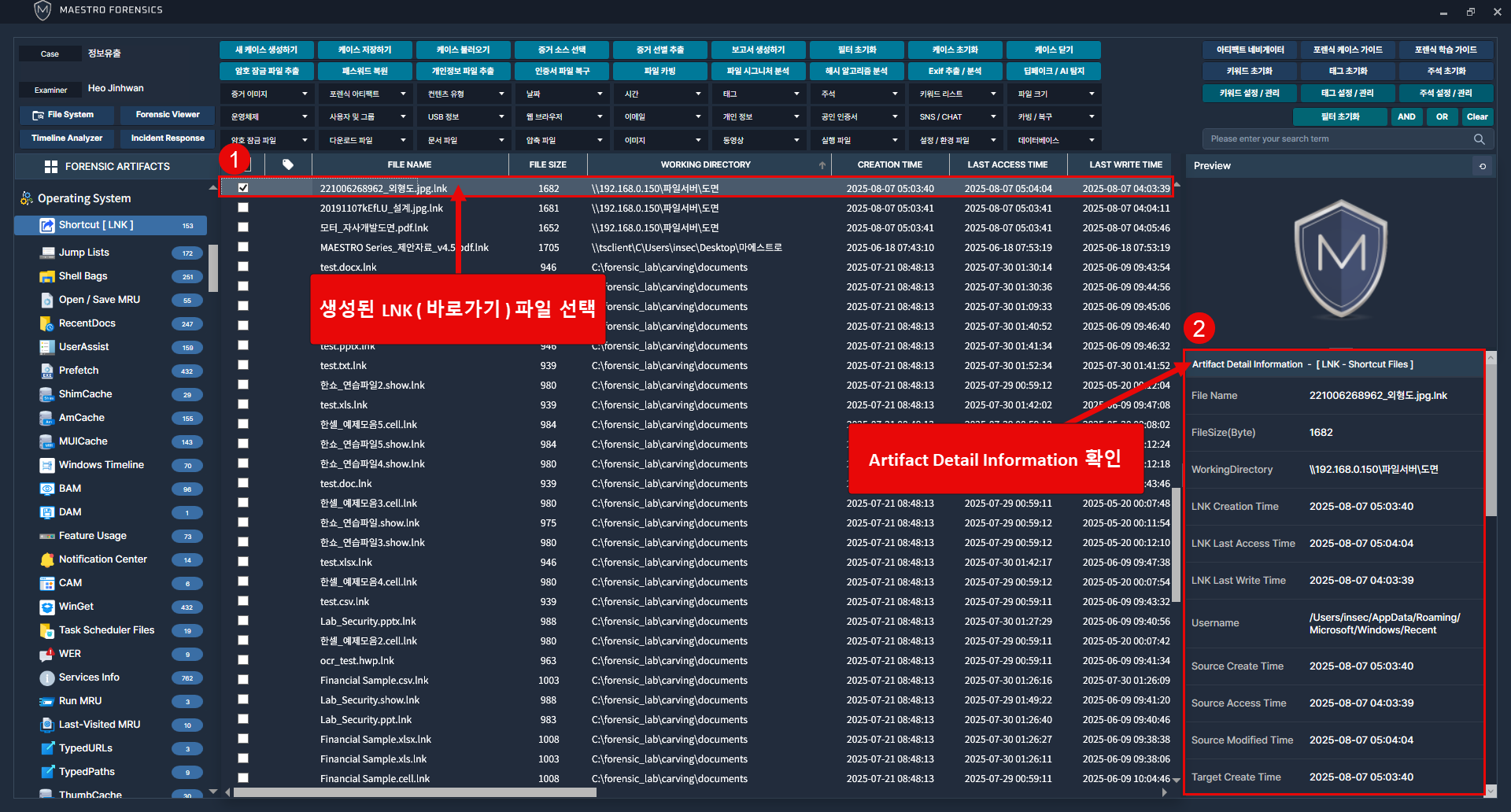 좌측 운영체제 카테고리에서 Lnk File 아티팩트 클릭