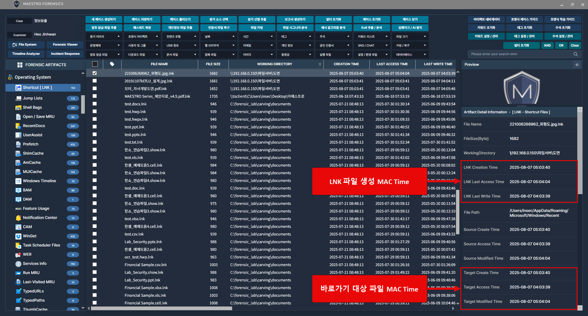 [Artifacts Detail Information] 박스를 통해 링크 파일의 맥타임(MAC Time) 분석을 진행.