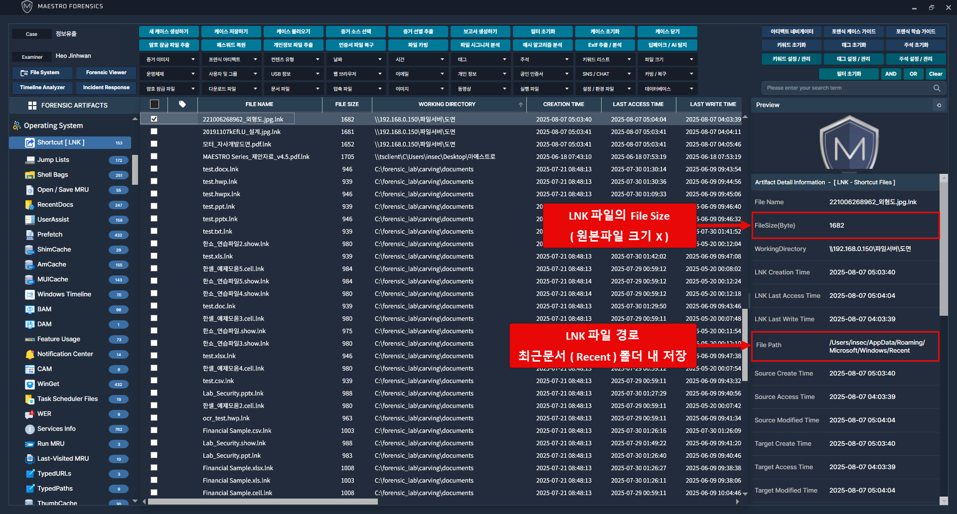 .lnk 파일 분석을 통해 파일 이름, 원본 경로, 크기, .lnk 파일 생성/수정 날짜, 원본 생성/수정 날짜, 시리얼 넘버, 드라이브 타입 등 확인 가능