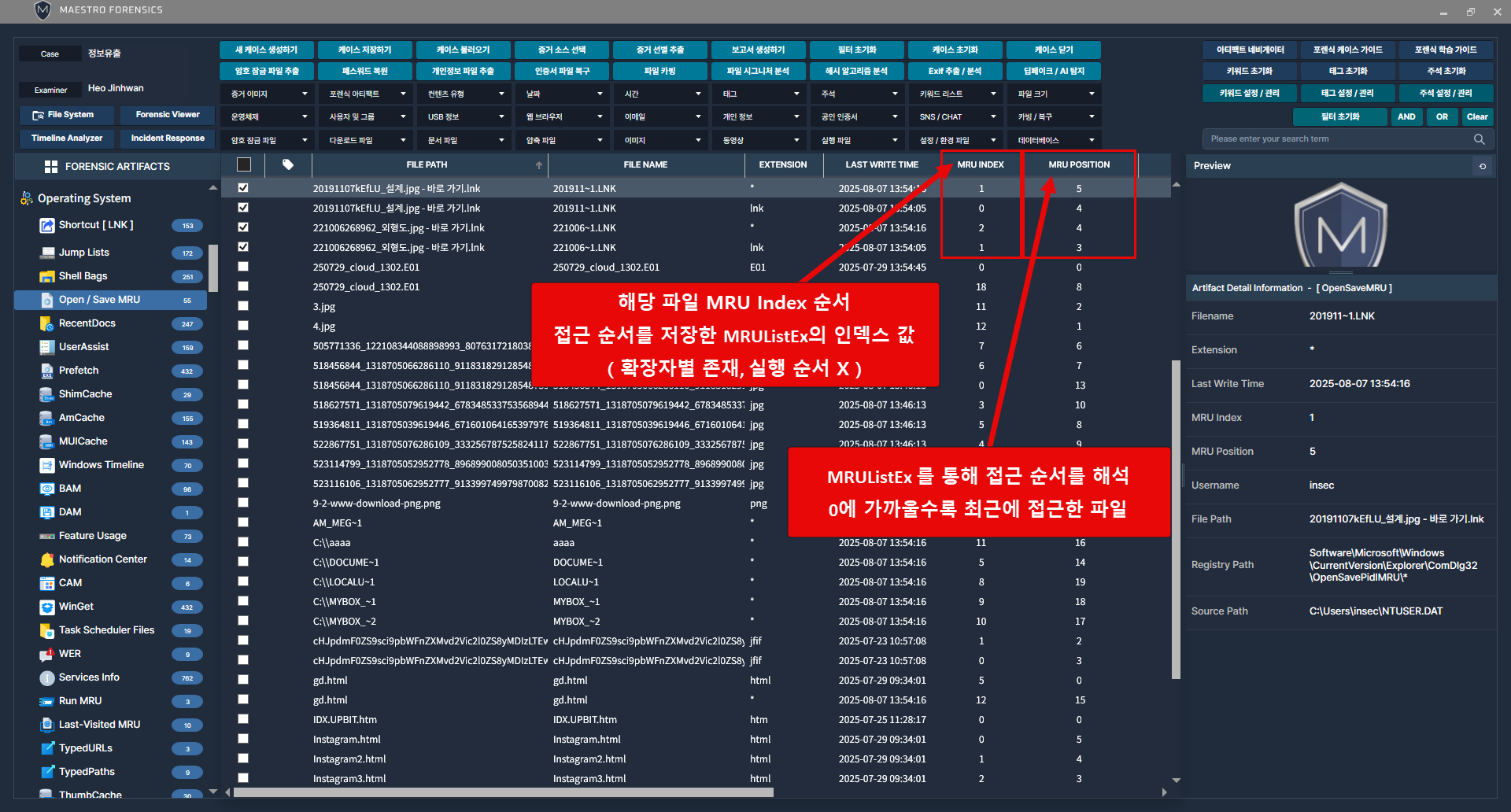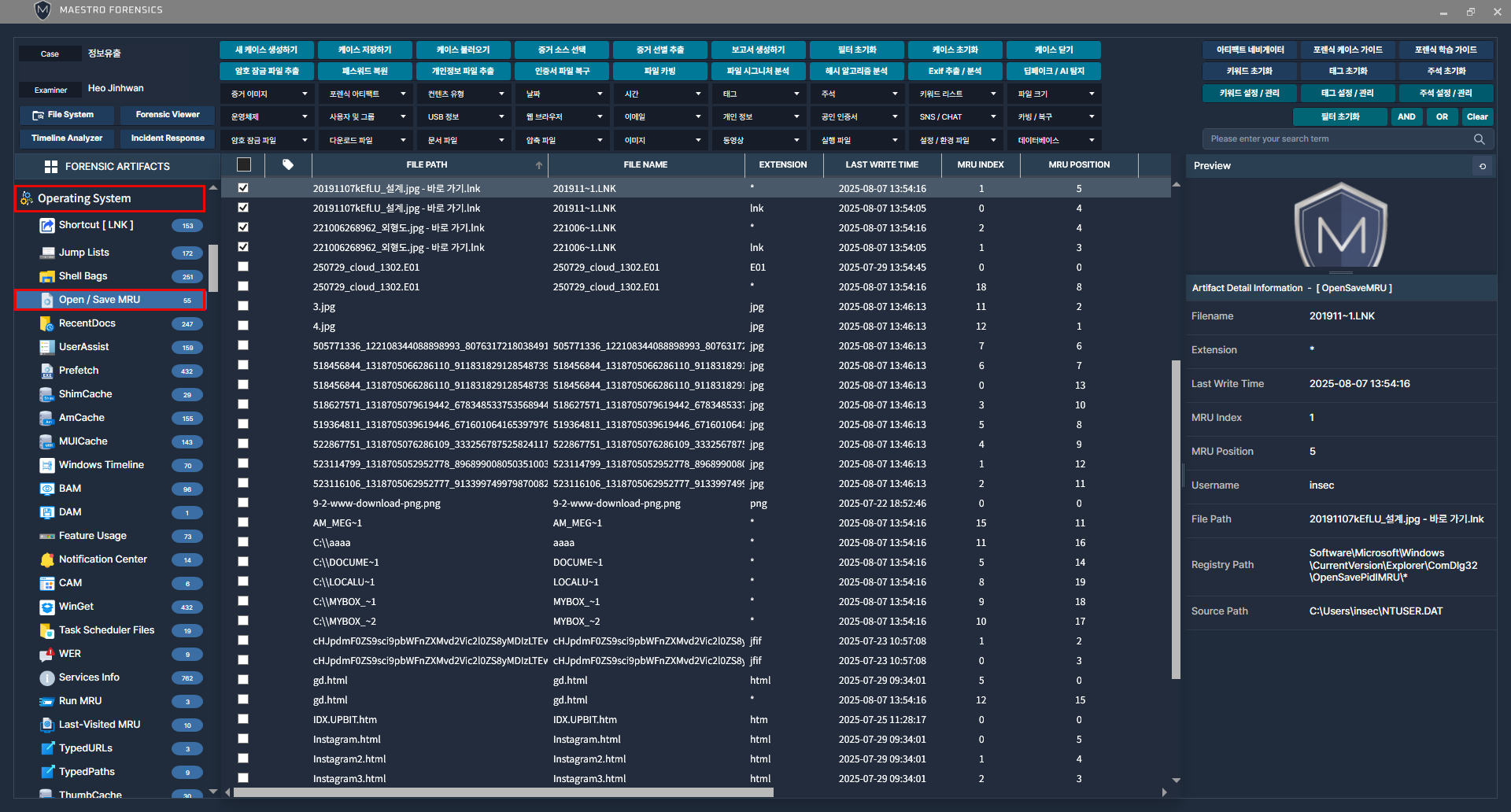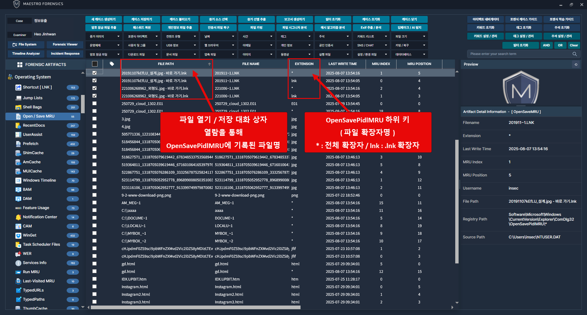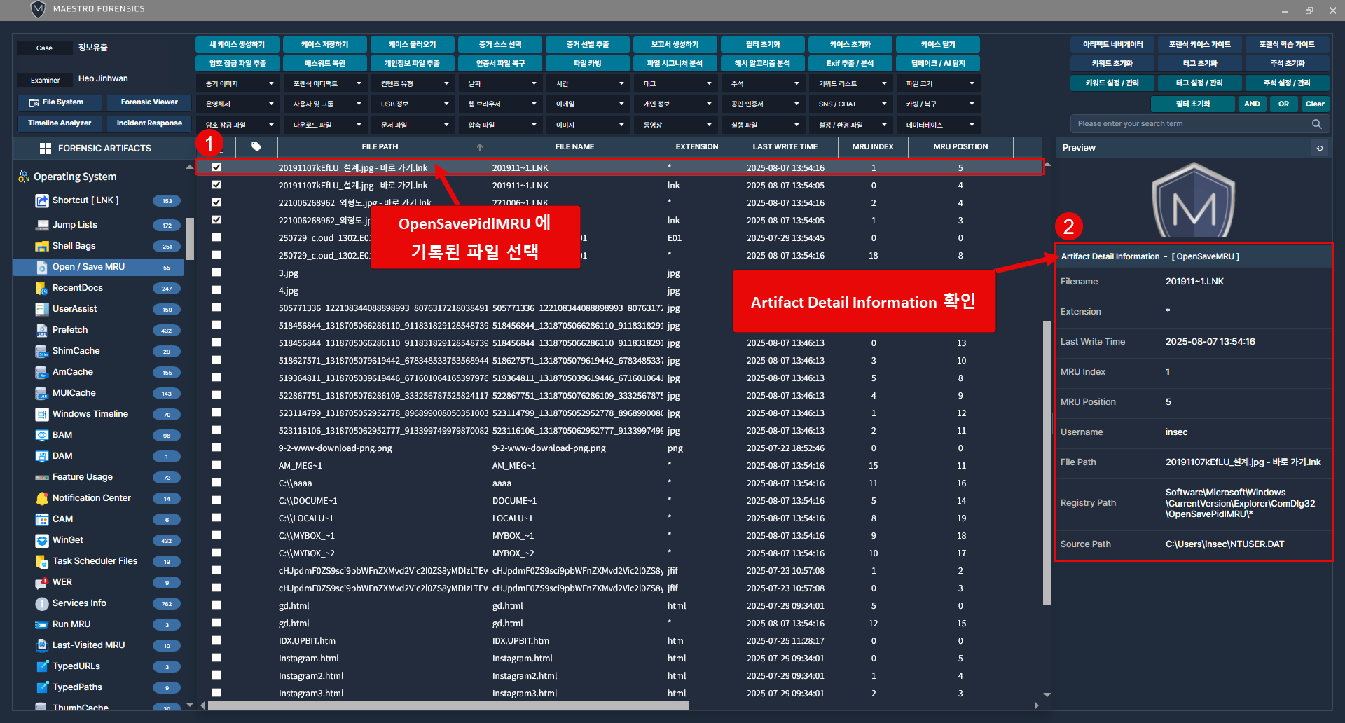 좌측 운영체제 카테고리에서 MRU 열린/저장된 파일 아티팩트 클릭