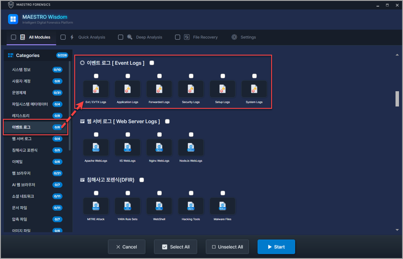 [ Select All ]을 통해 모든 아티팩트 수집 또는 단일 이벤트 로그 아티팩트 수집 가능
