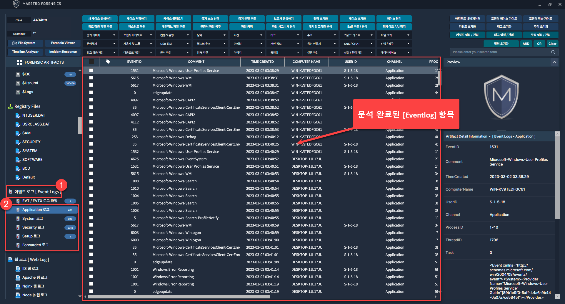 수집 완료된 결과는 [이벤트 로그] - [Windows Eventlogs] 카테고리를 통해 확인 가능