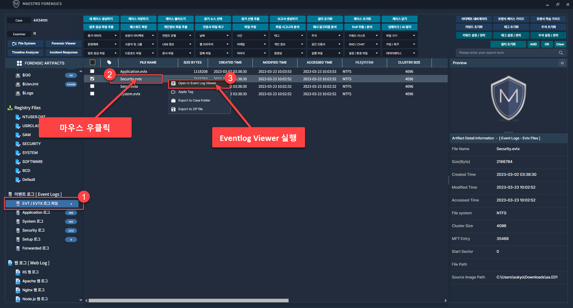 Appliacation.evtx, System.evtx, Setup.evtx, Security.evtx를 확인할 수 있습니다.