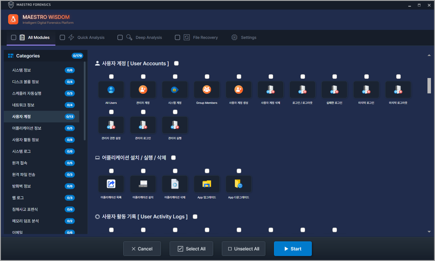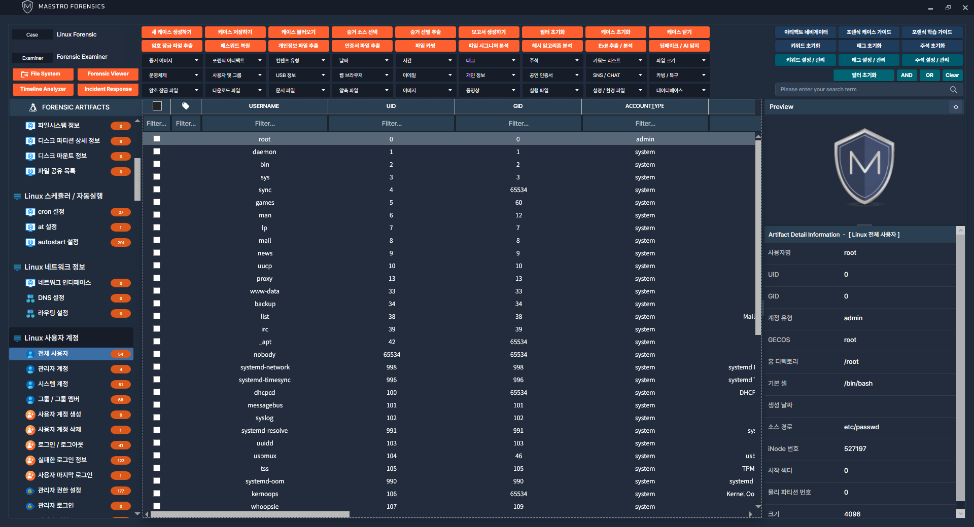 리눅스의 사용자 계정 정보를 추출하기 위해 [ 사용자 계정 ] 아티팩트를 선택합니다.