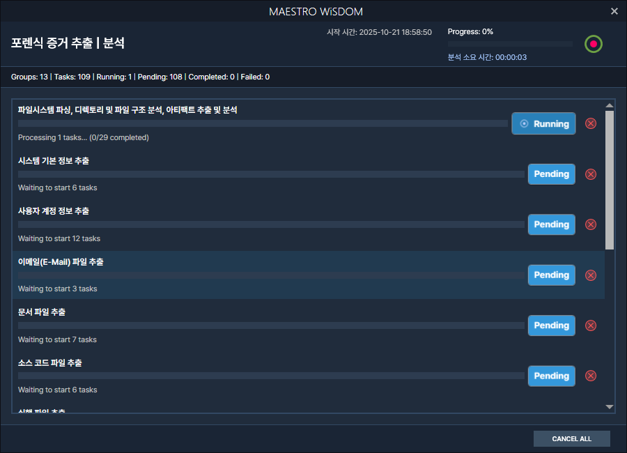 아티팩트 선택 종료 후 추출을 시작하면 스크린샷과 같이 프로세싱 진행 상태를 확인할 수 있습니다.