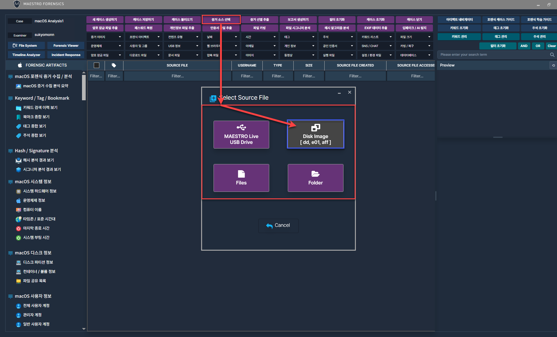 증거 데이터 추가를 위해 [ 증거소스 선택 ] 버튼을 클릭 후 증거 데이터를 불러올 방법을 선택합니다.