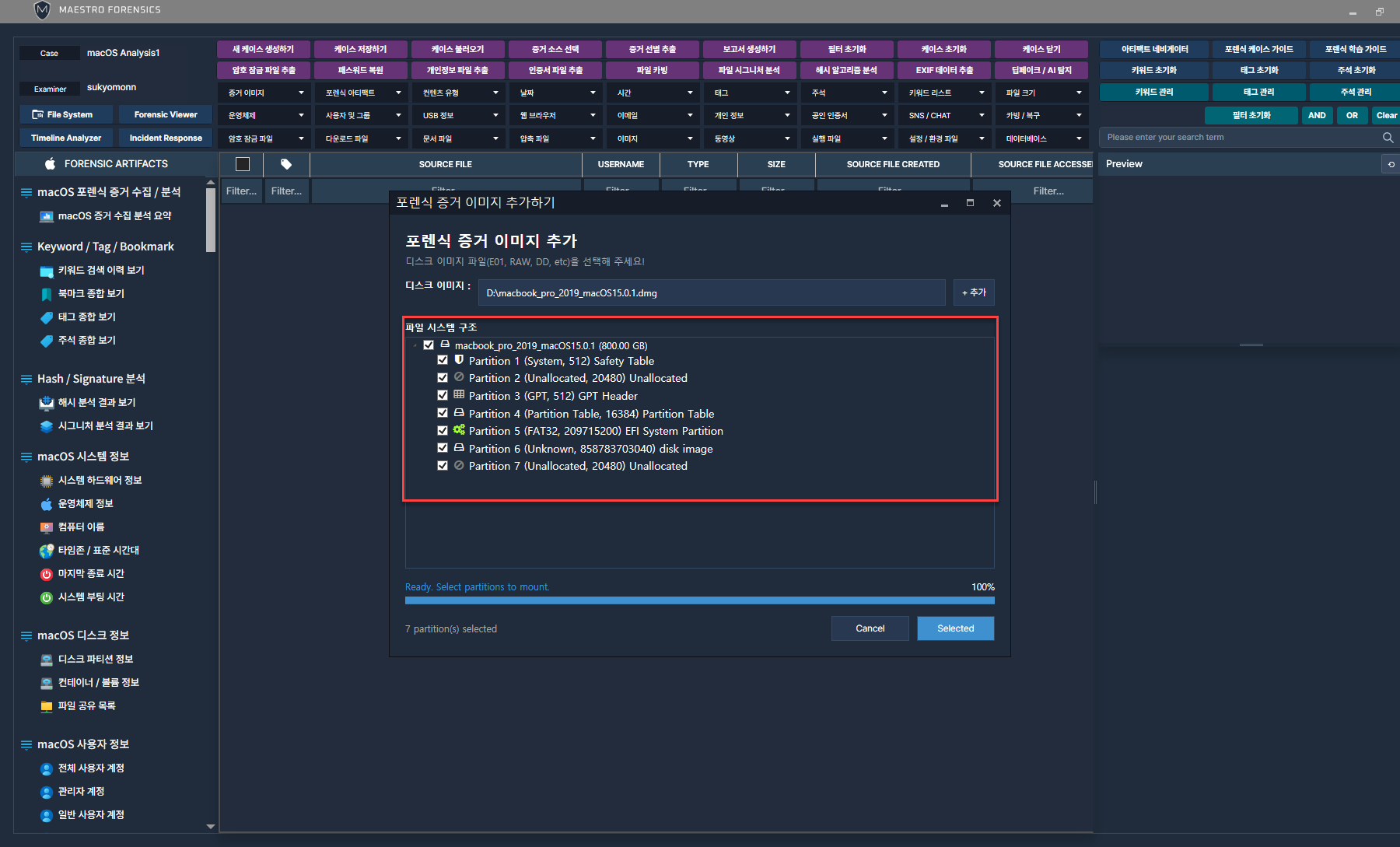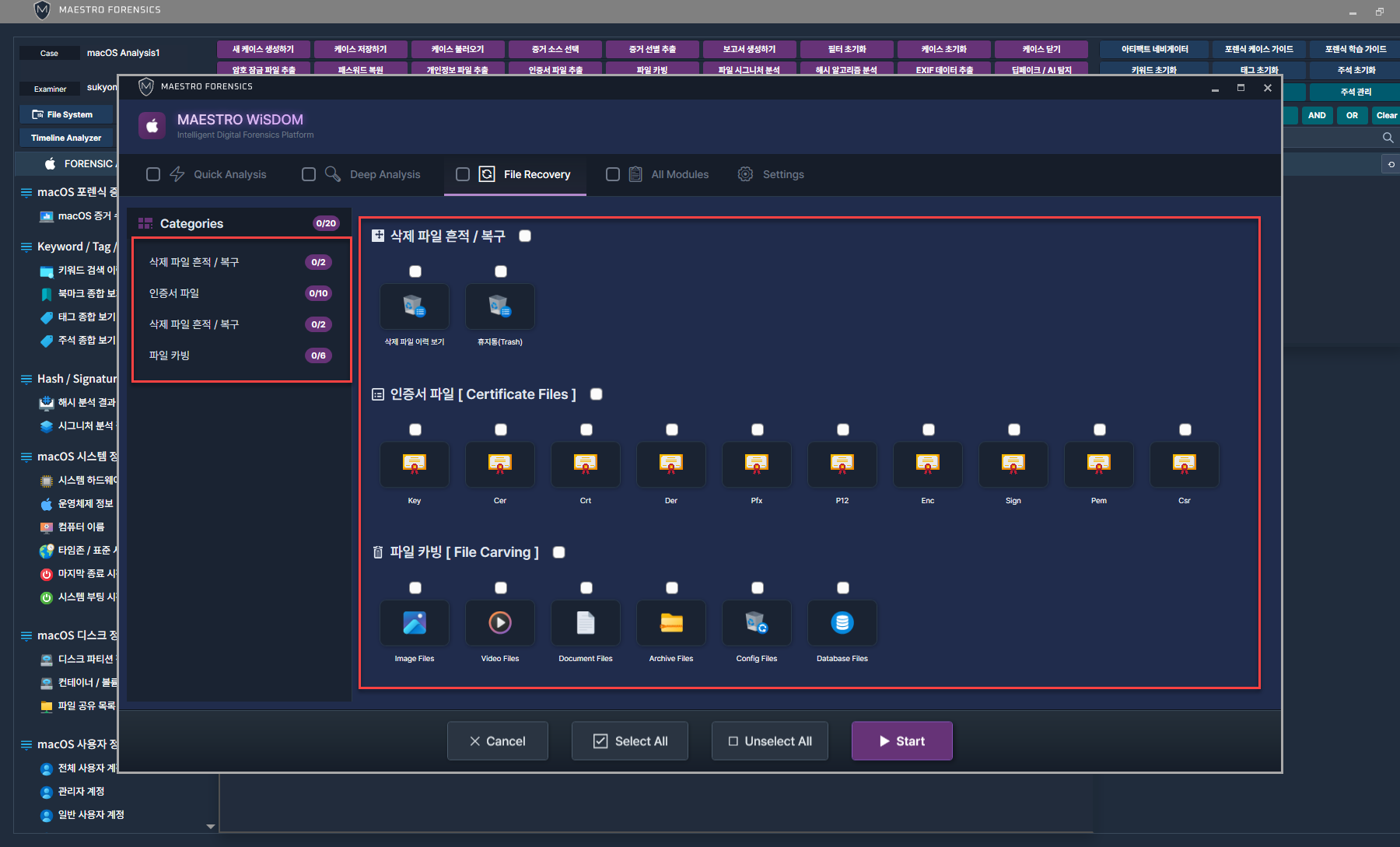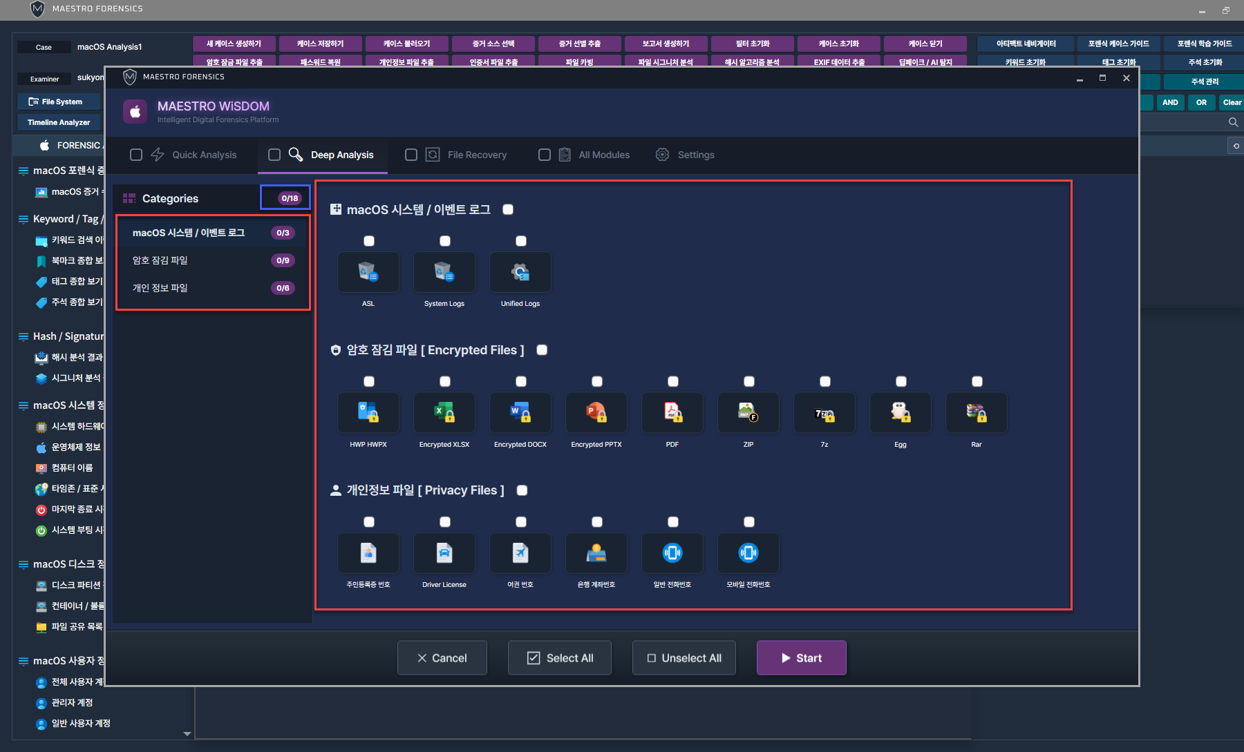 MAESTRO WiSDOM의 아티팩트 분석 모듈 중 [ 파일 시스템, 개인정보 파일, 암호 잠금 파일 ] 등 로우 분석 선택 화면입니다.