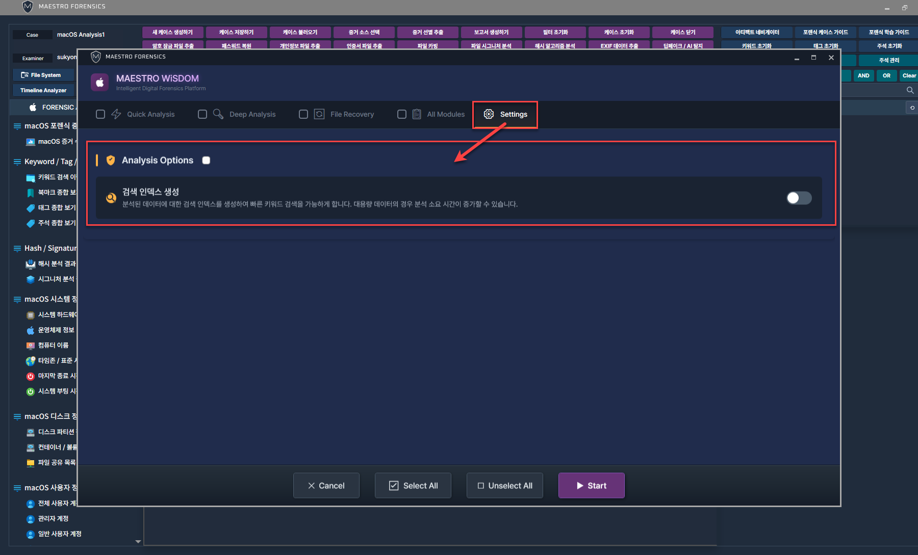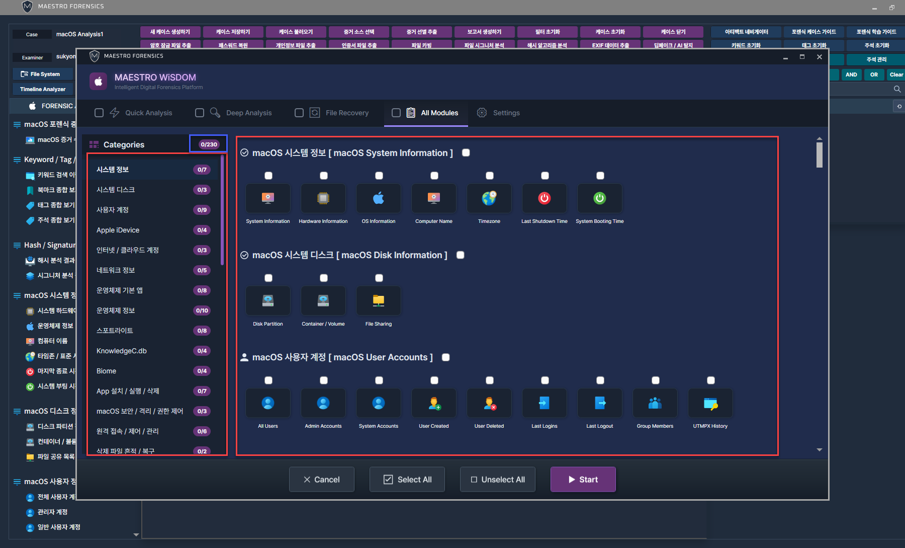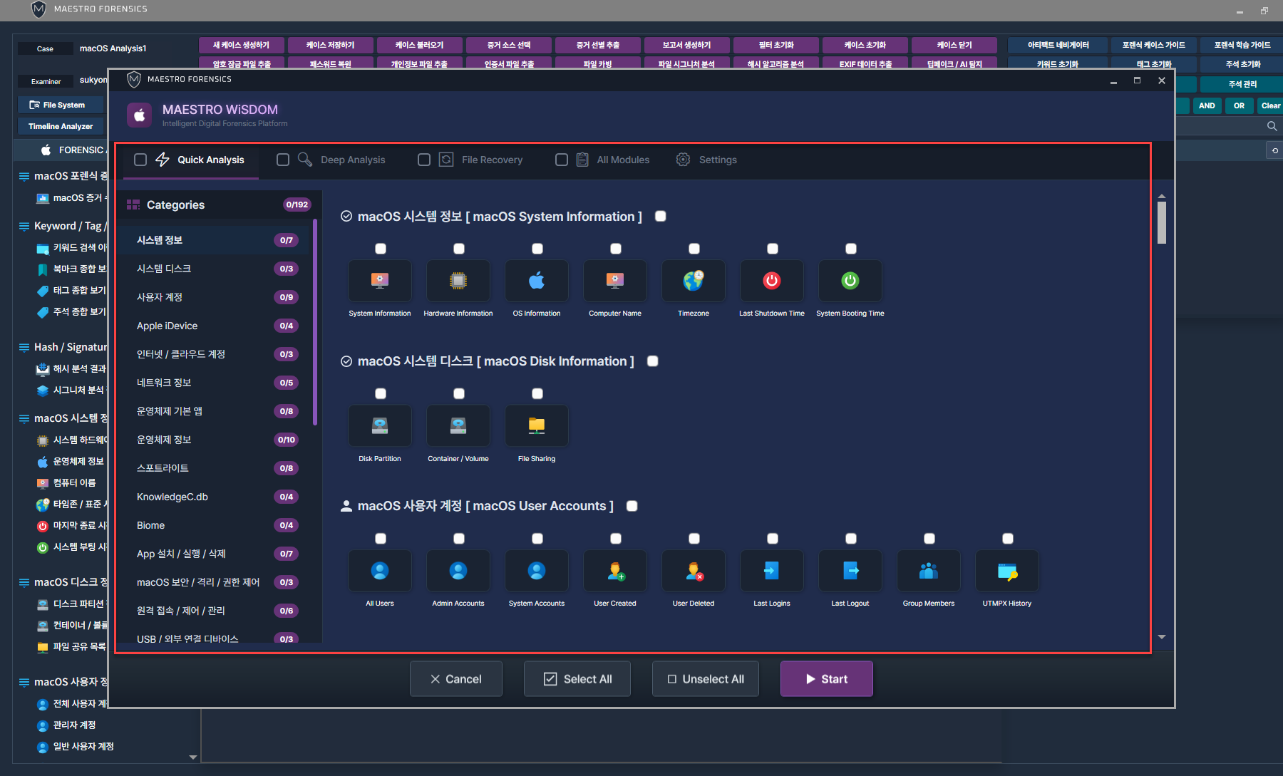 MAESTRO WiSDOM의 아티팩트 분석 모듈 중 [ 파일 시스템, 개인정보 파일, 암호 잠금 파일 ] 등 로우 분석 선택 화면입니다.