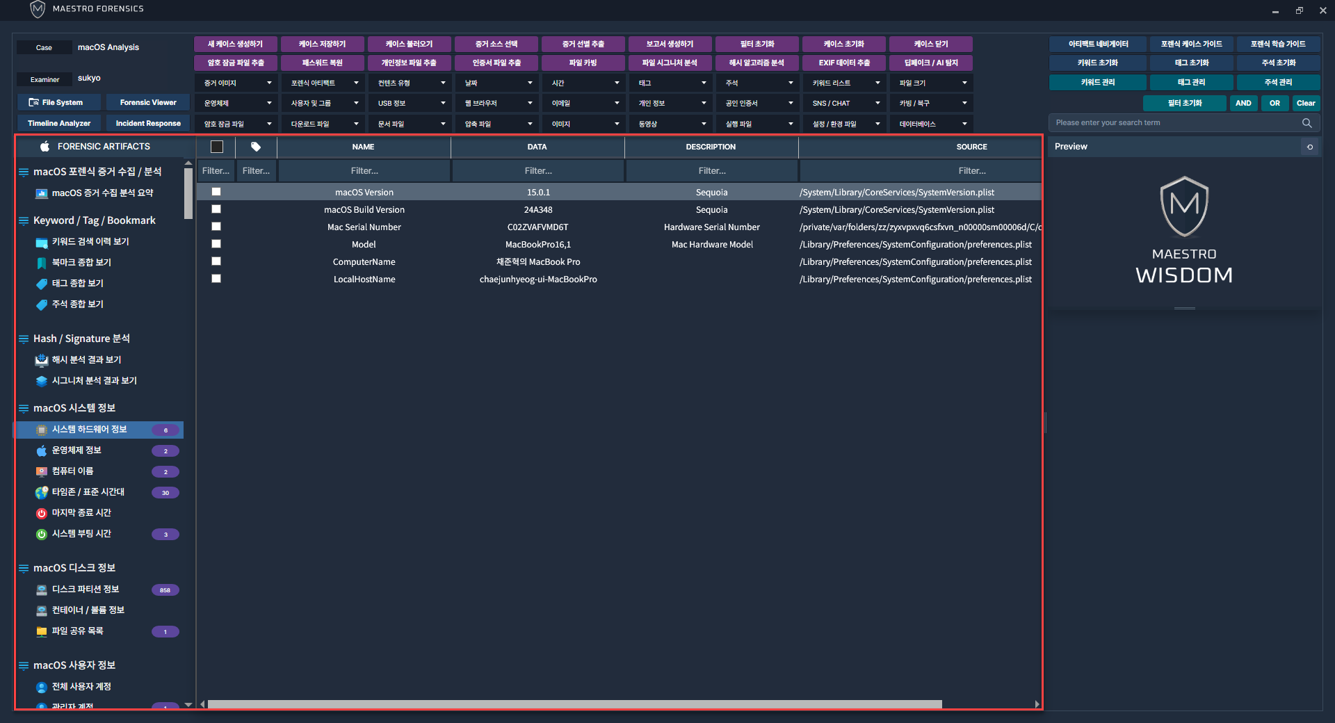 MAESTRO WiSDOM에서 제공하는 아티팩트 항목을 확인할 수 있습니다.