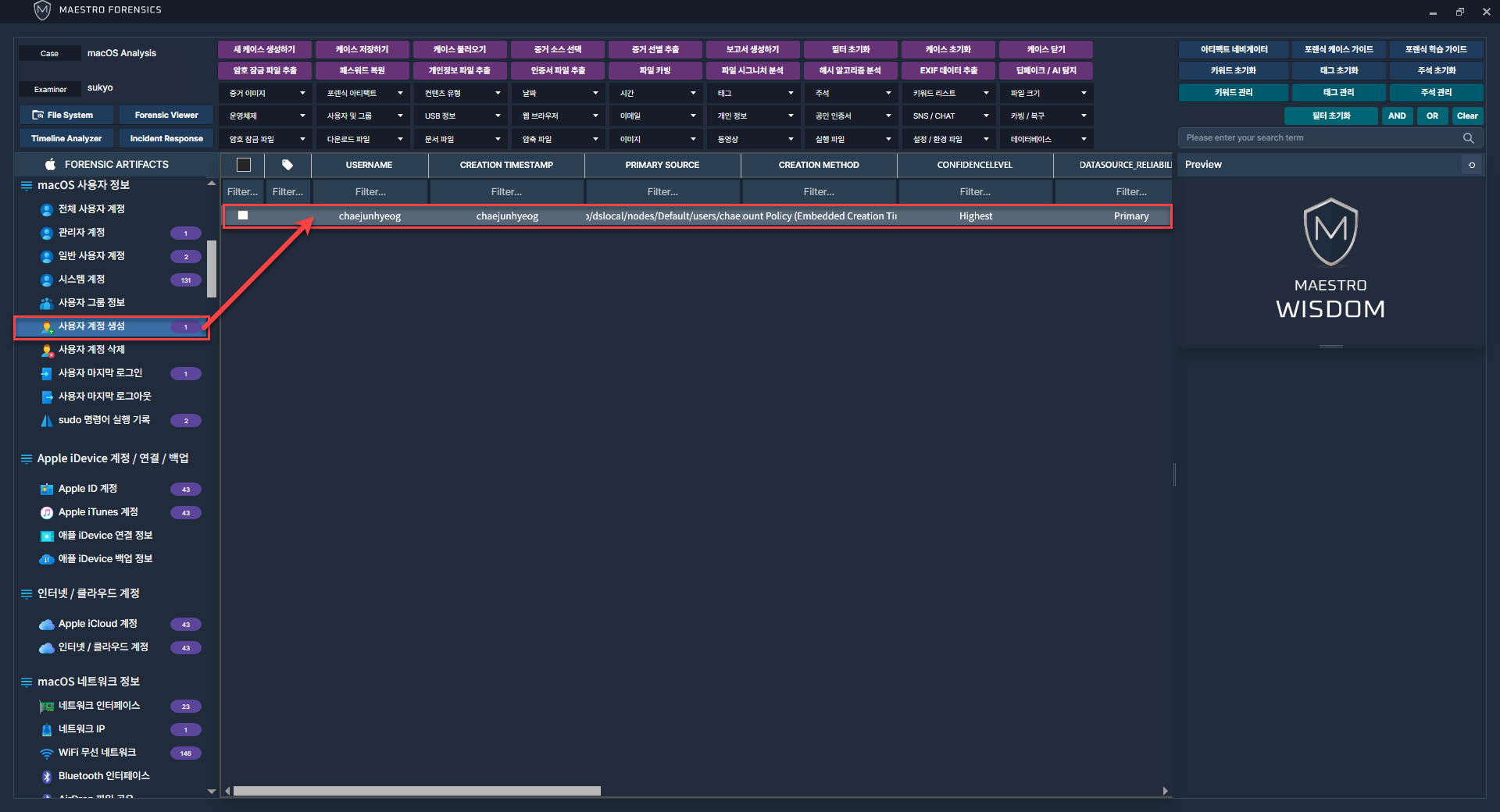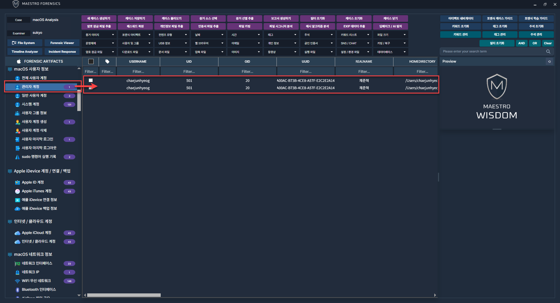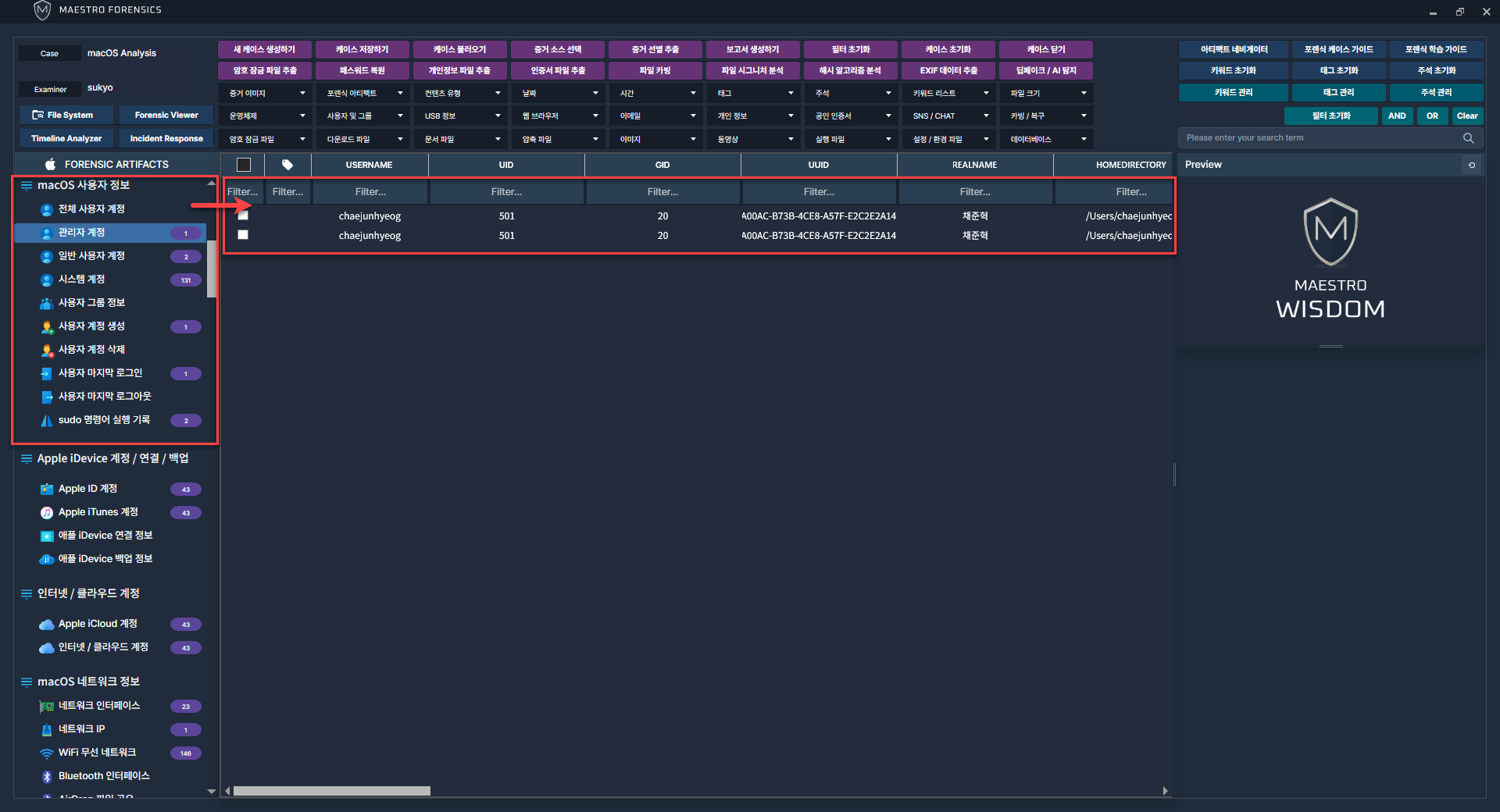 MAESTRO WiSDOM macOS에서 사용자 계정과 관련된 아티팩트를 선택 후 프로세스를 진행합니다.