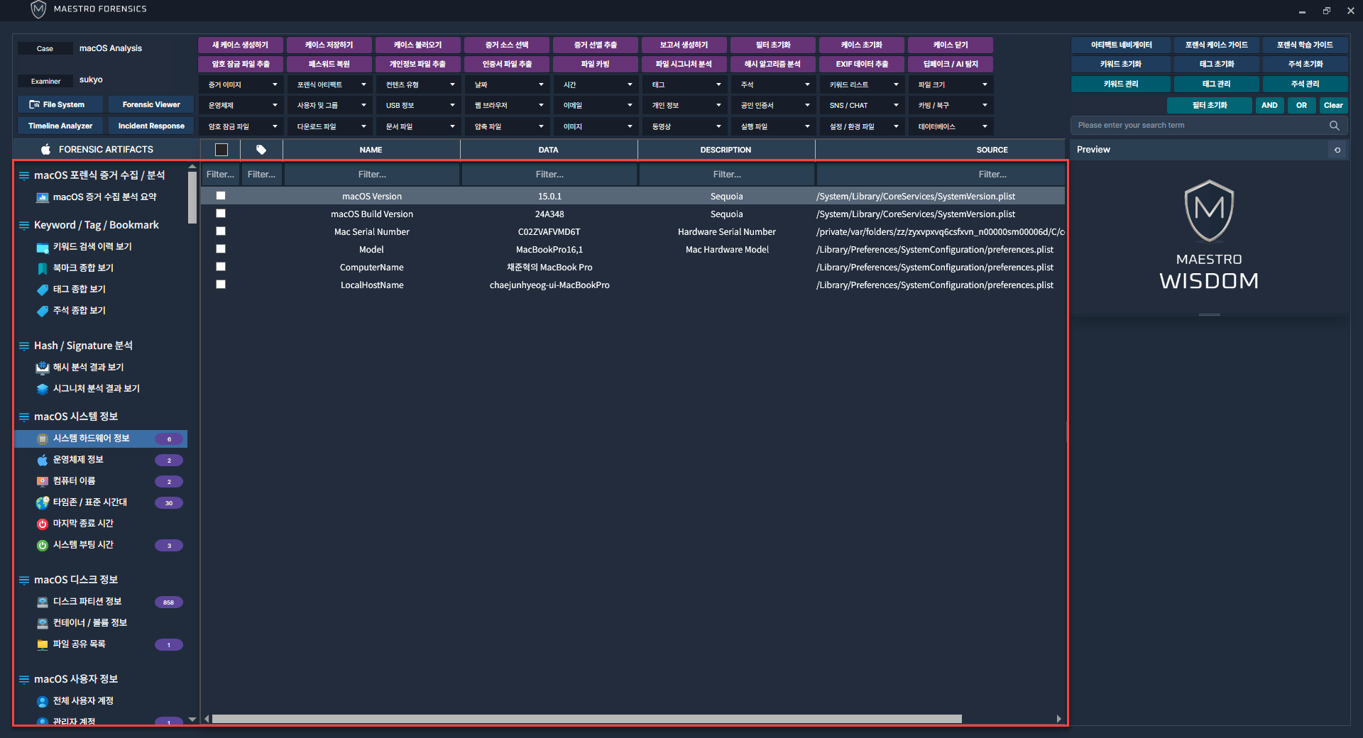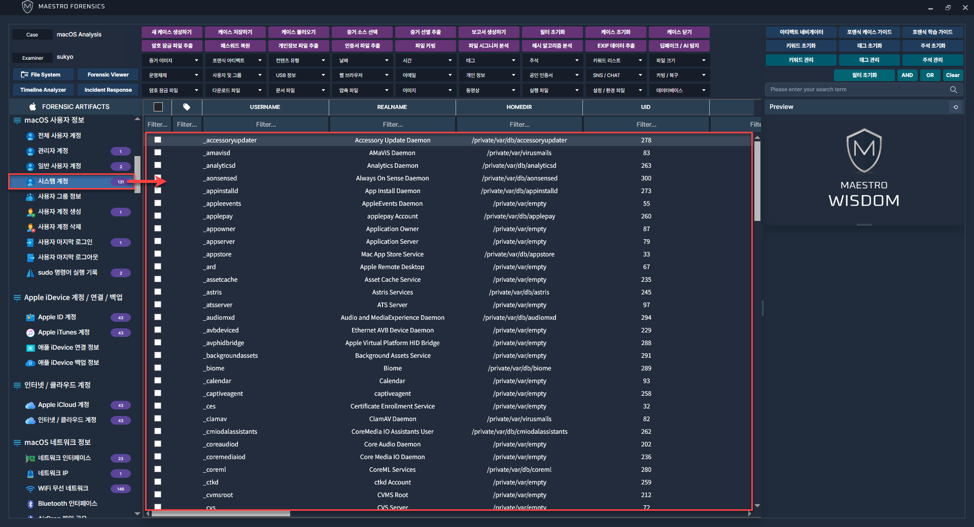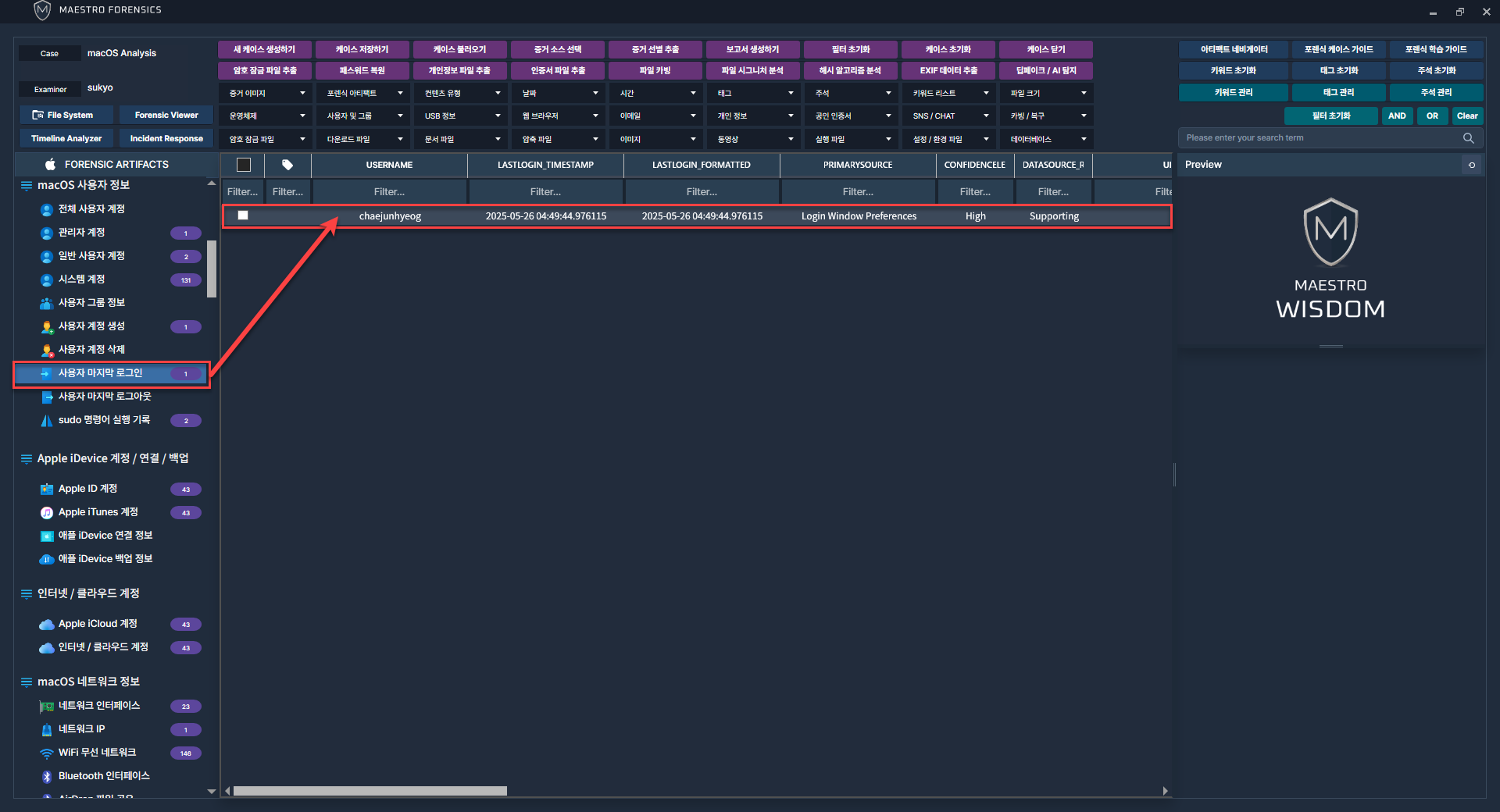 MAESTRO WiSDOM macOS에서 사용자 계정과 관련된 아티팩트를 선택 후 프로세스를 진행합니다.