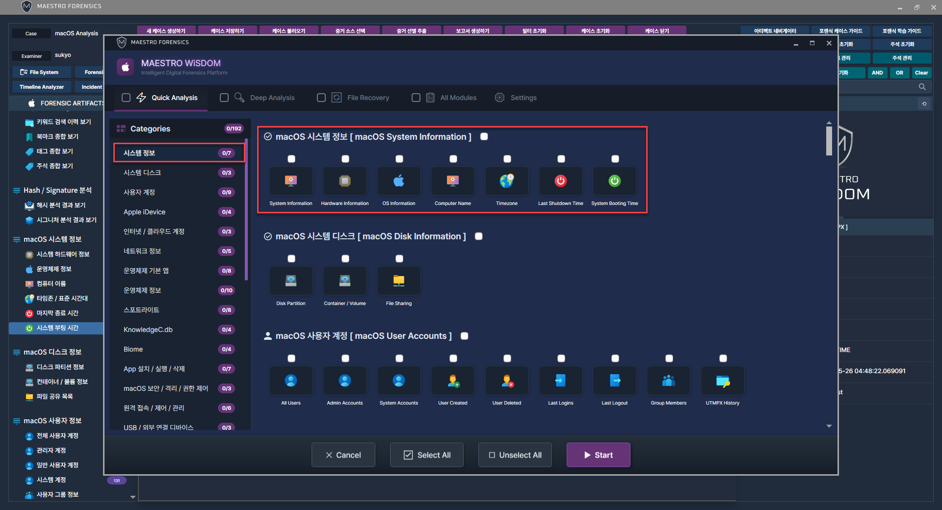 MEASTRO WiSDOM macOS에서 [ macOS 시스템 정보 ]와 관련된 아티팩트를 선택 후 프로세스를 진행합니다.