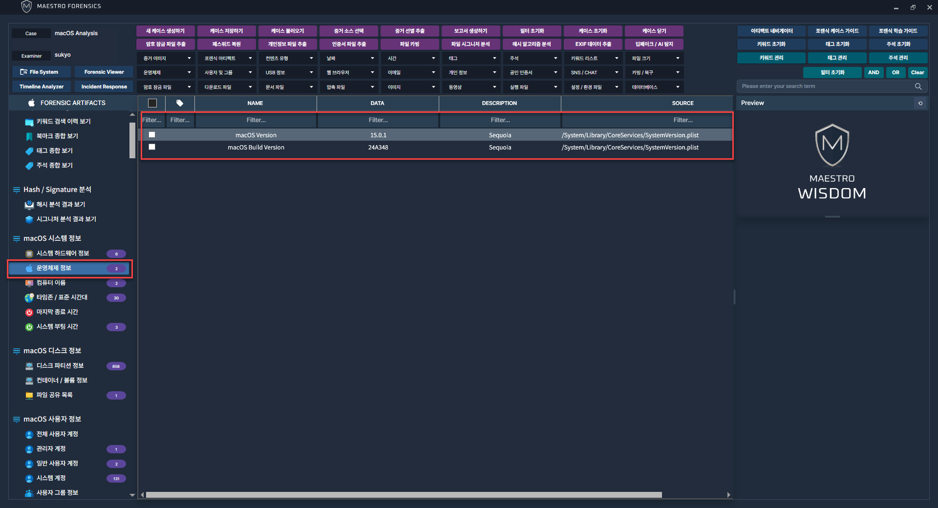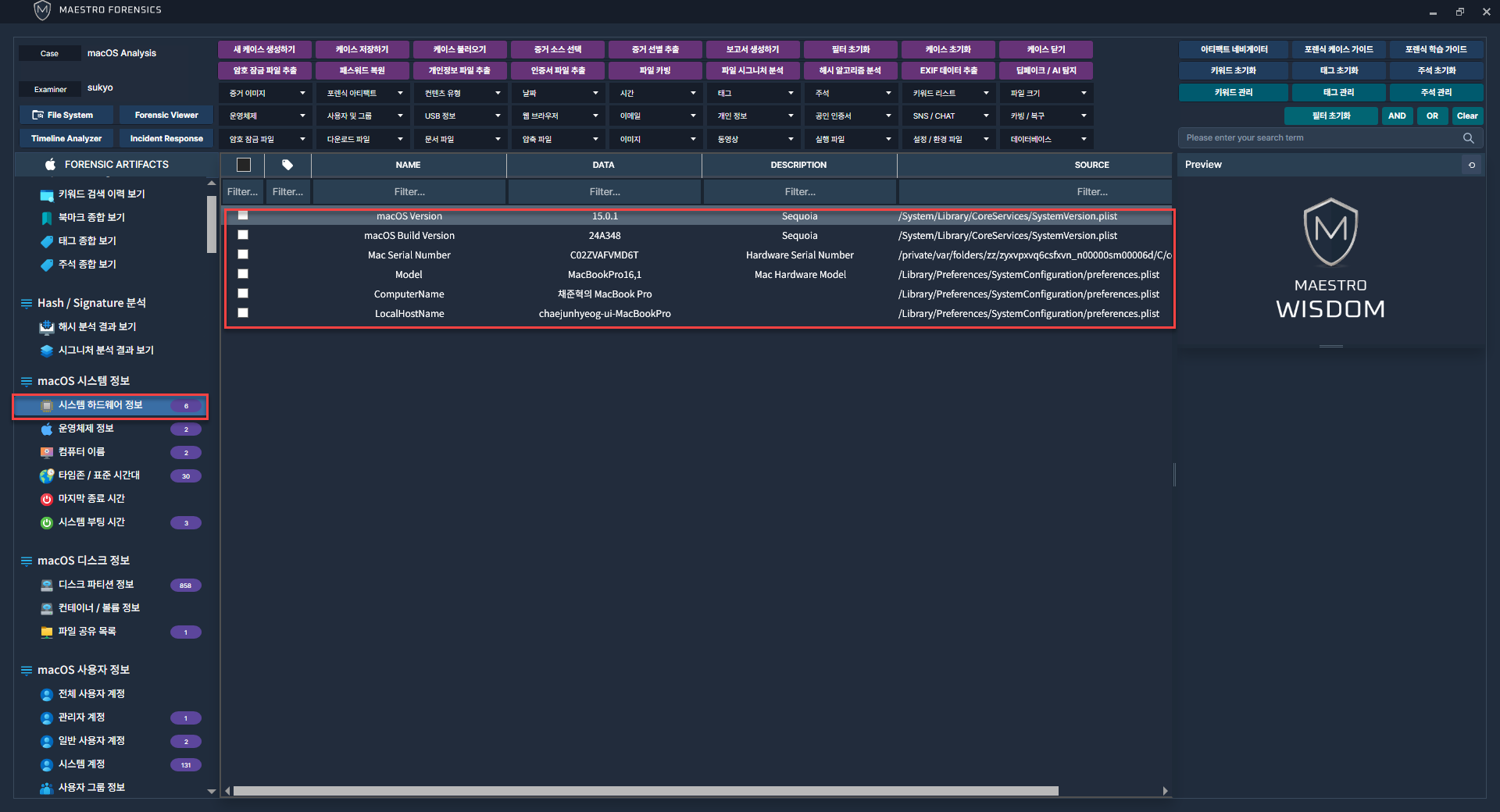 WiSDOM macOS에서 제공하는 다양한 아티팩트 중 [ macOS 시스템 정보 ] 카테고리를 통해 수집 완료된 아티팩트 정보 분석이 가능합니다.