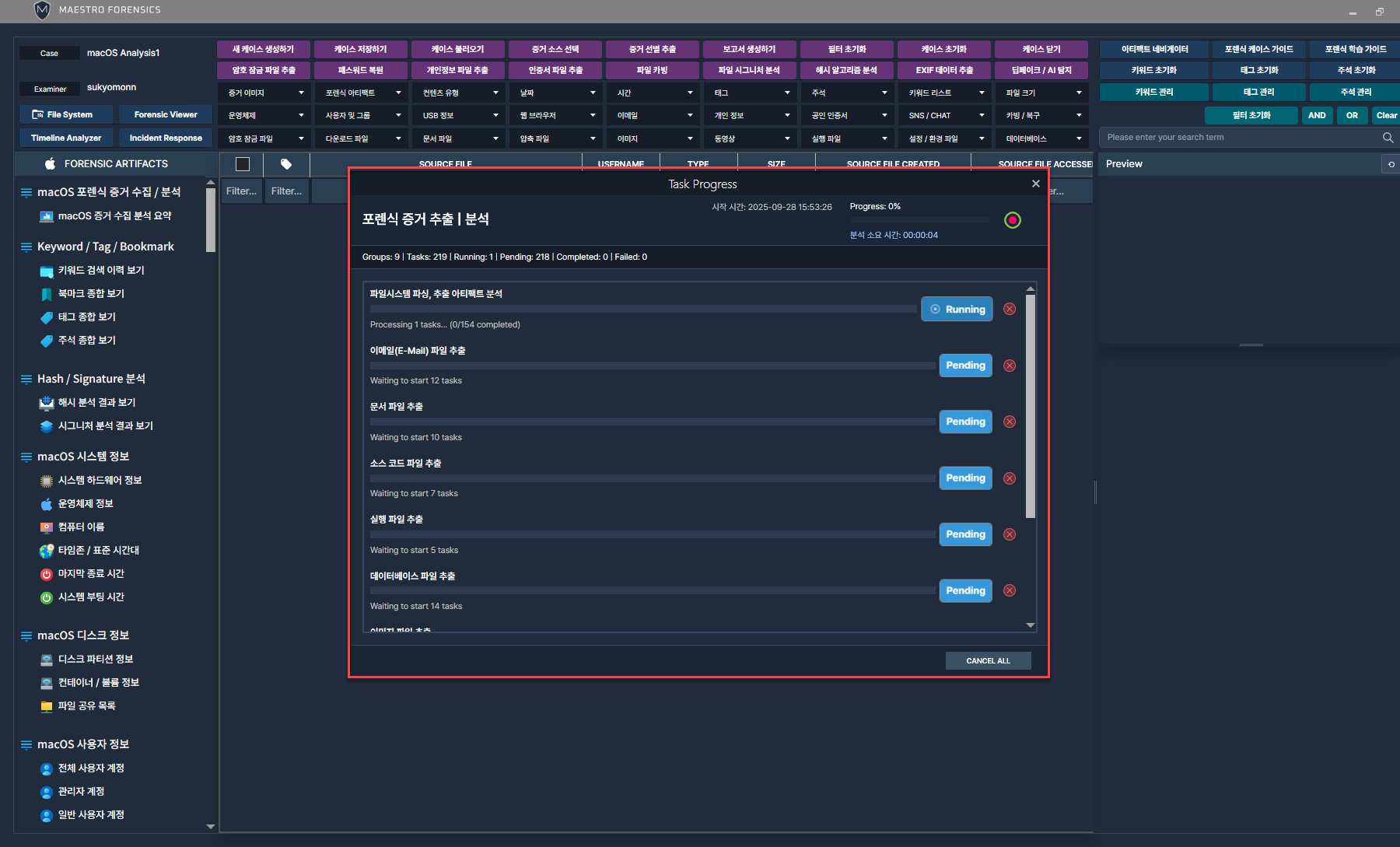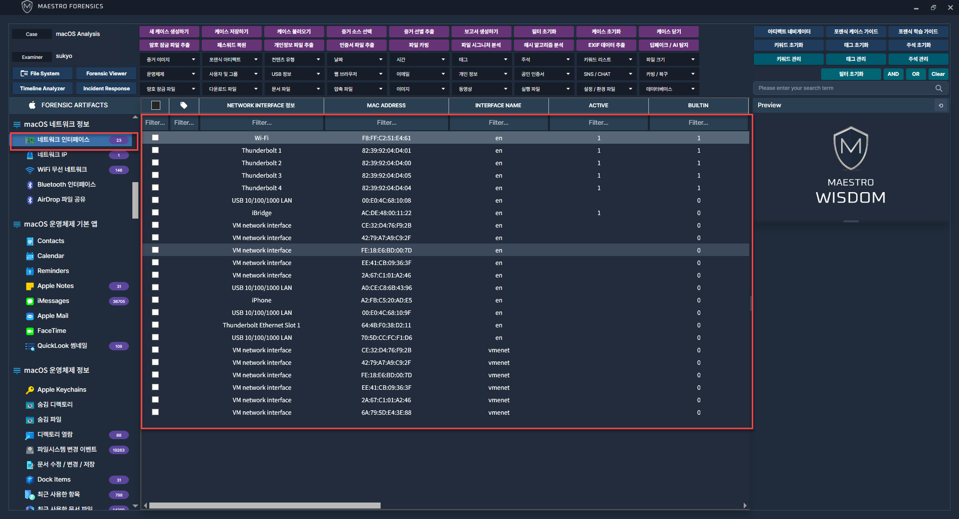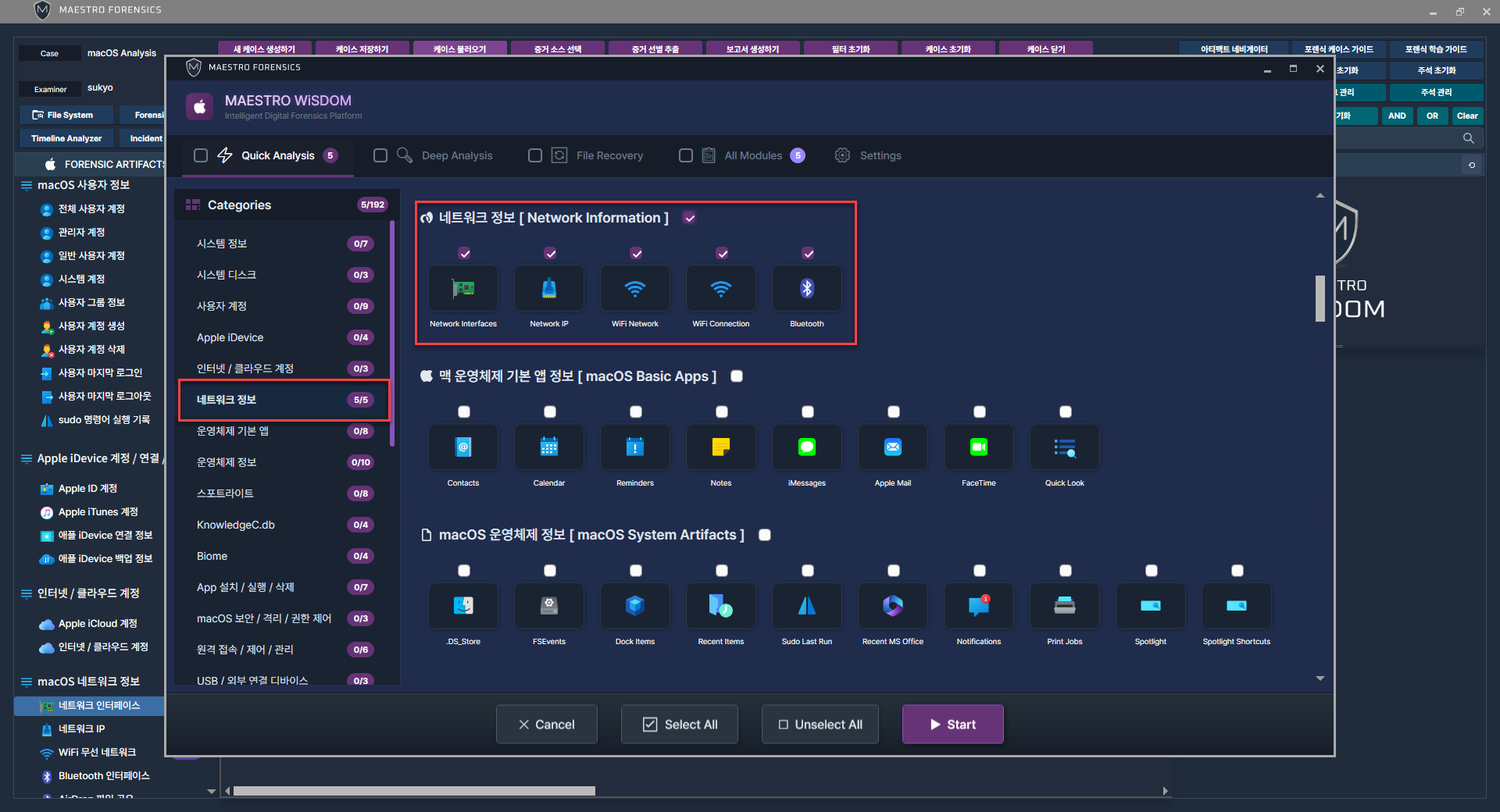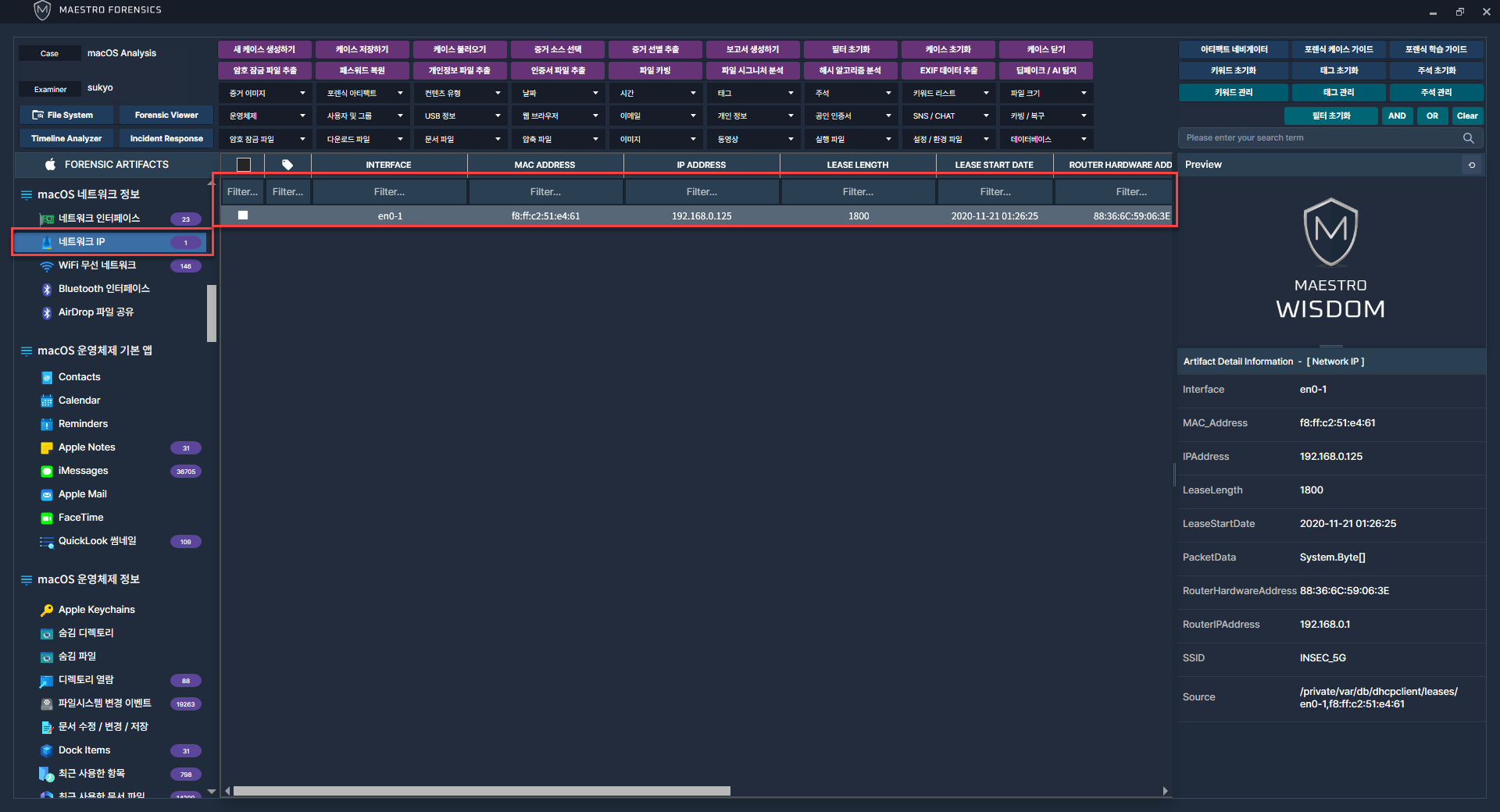MEASTRO WiSDOM macOS에서 네트워크와 관련된 아티팩트를 선택 후 프로세스를 진행합니다.