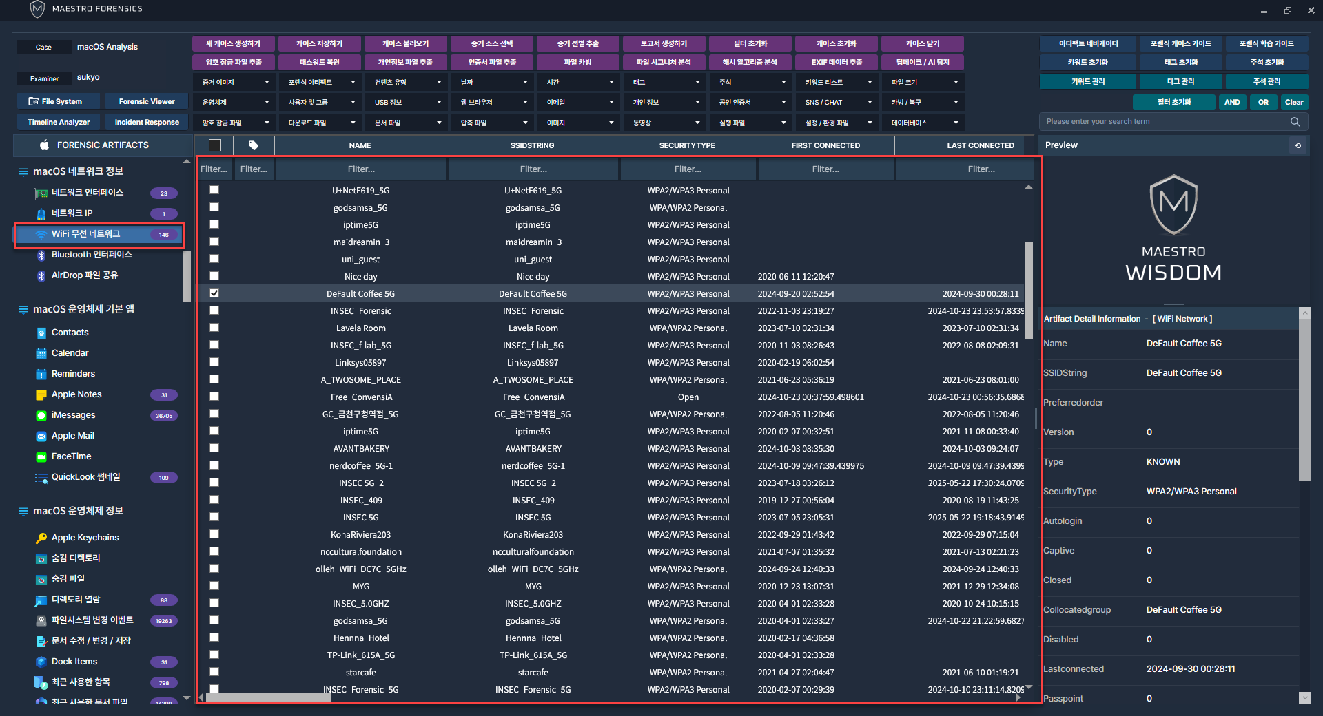 WiSDOM macOS에서 제공하는 다양한 아티팩트 중 [ macOS 네트워크 정보 ] 카테고리를 통해 계정을 분석할 수 있습니다.