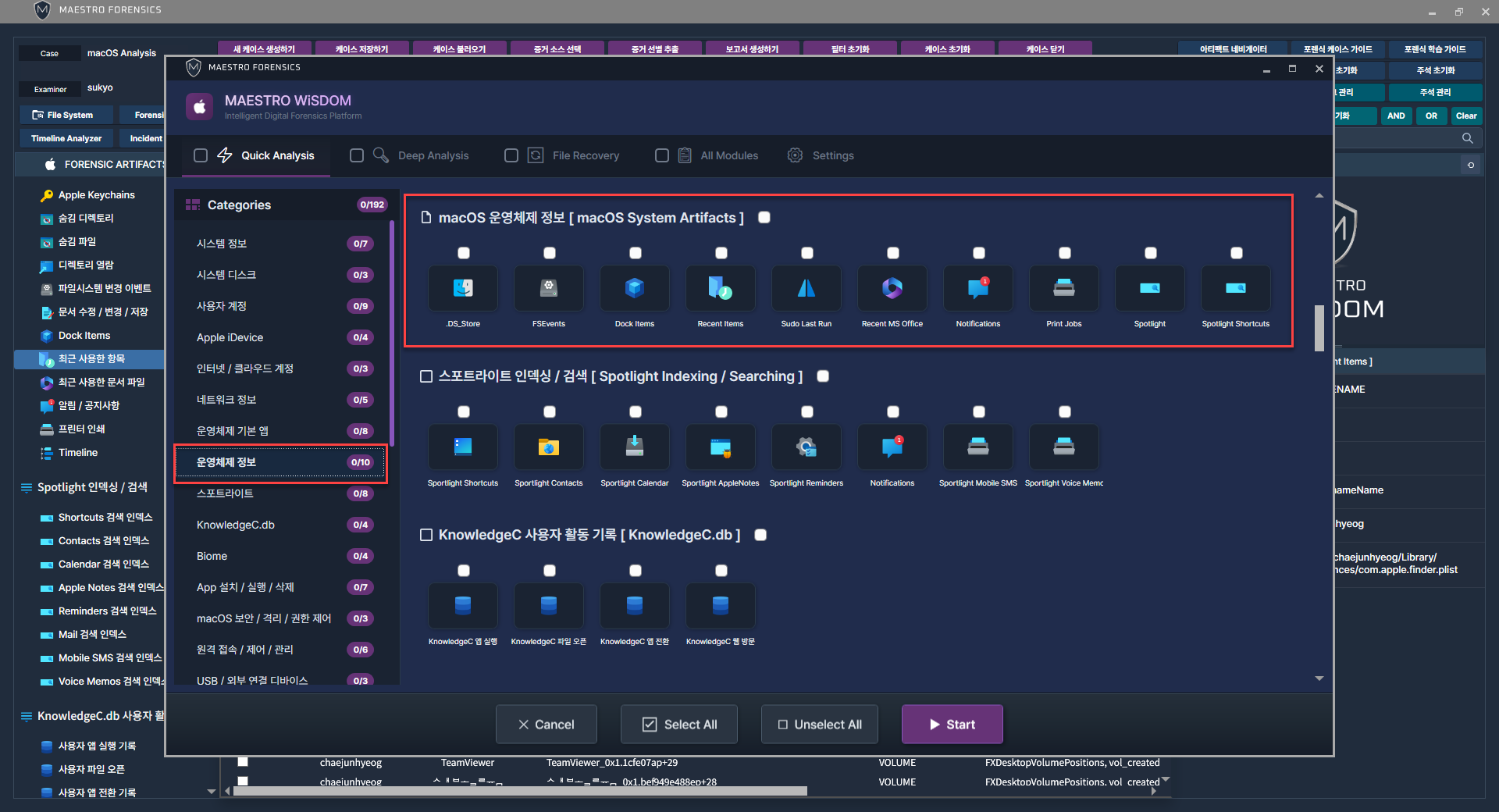 MEASTRO WiSDOM macOS에서 [ macOS 운영체제 정보 ]와 관련된 아티팩트를 선택 후 프로세스를 진행합니다.