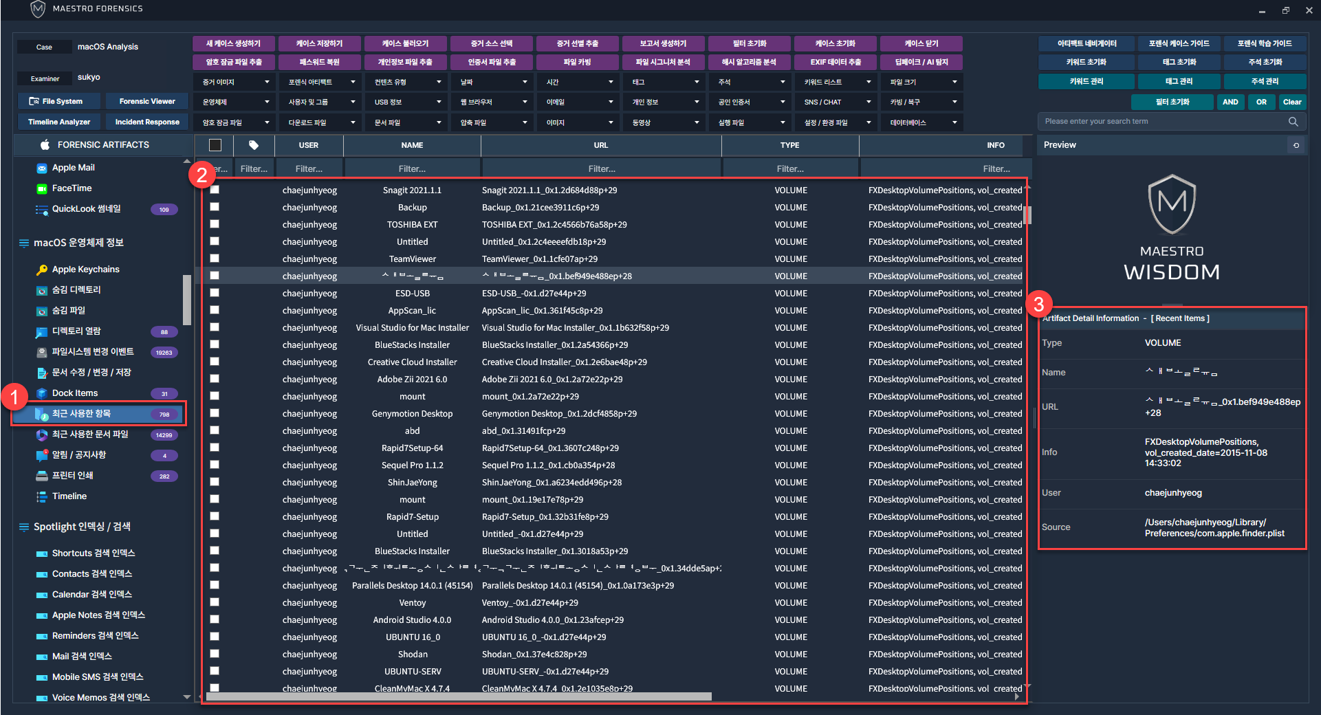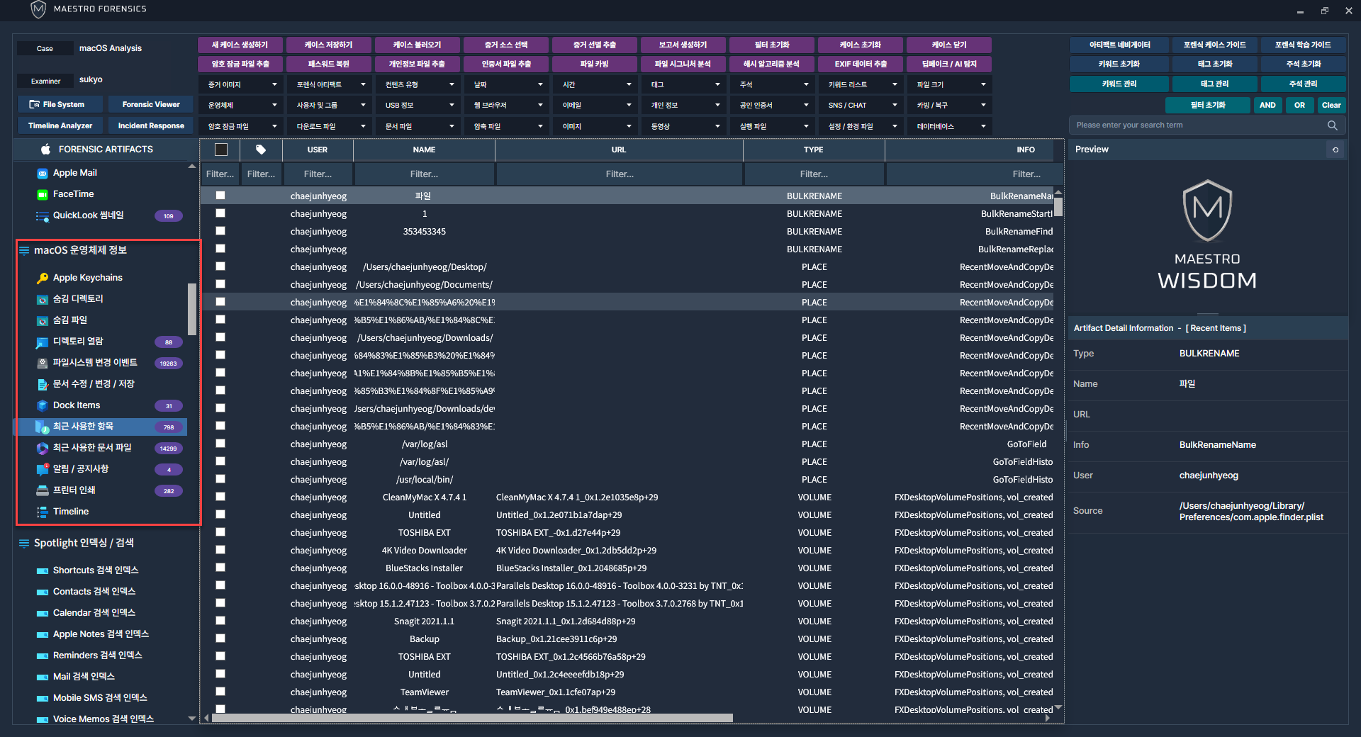 WiSDOM macOS에서 제공하는 다양한 아티팩트 중 [ macOS 운영체제 정보 ] 카테고리를 통해 수집 완료된 아티팩트 정보 분석이 가능합니다.