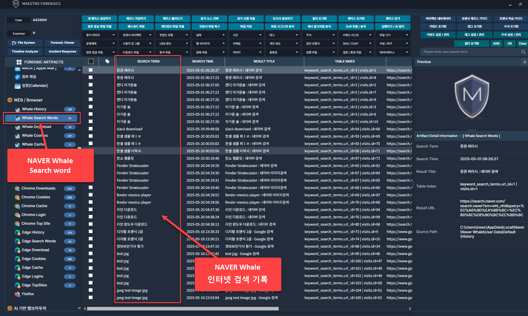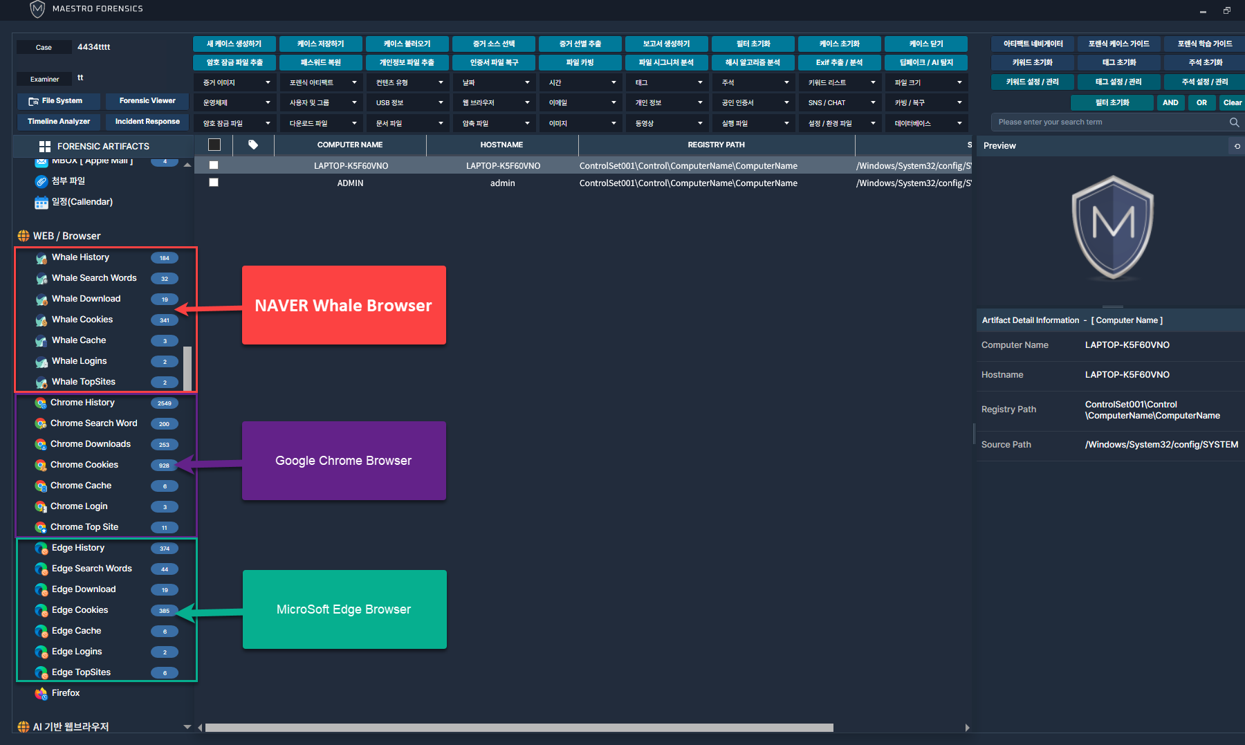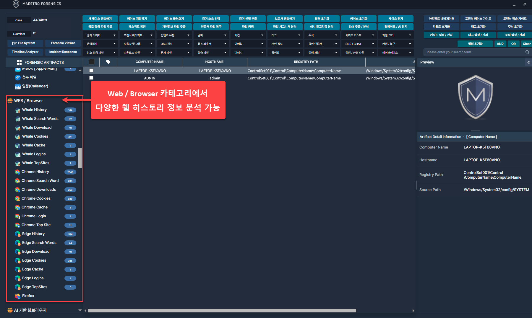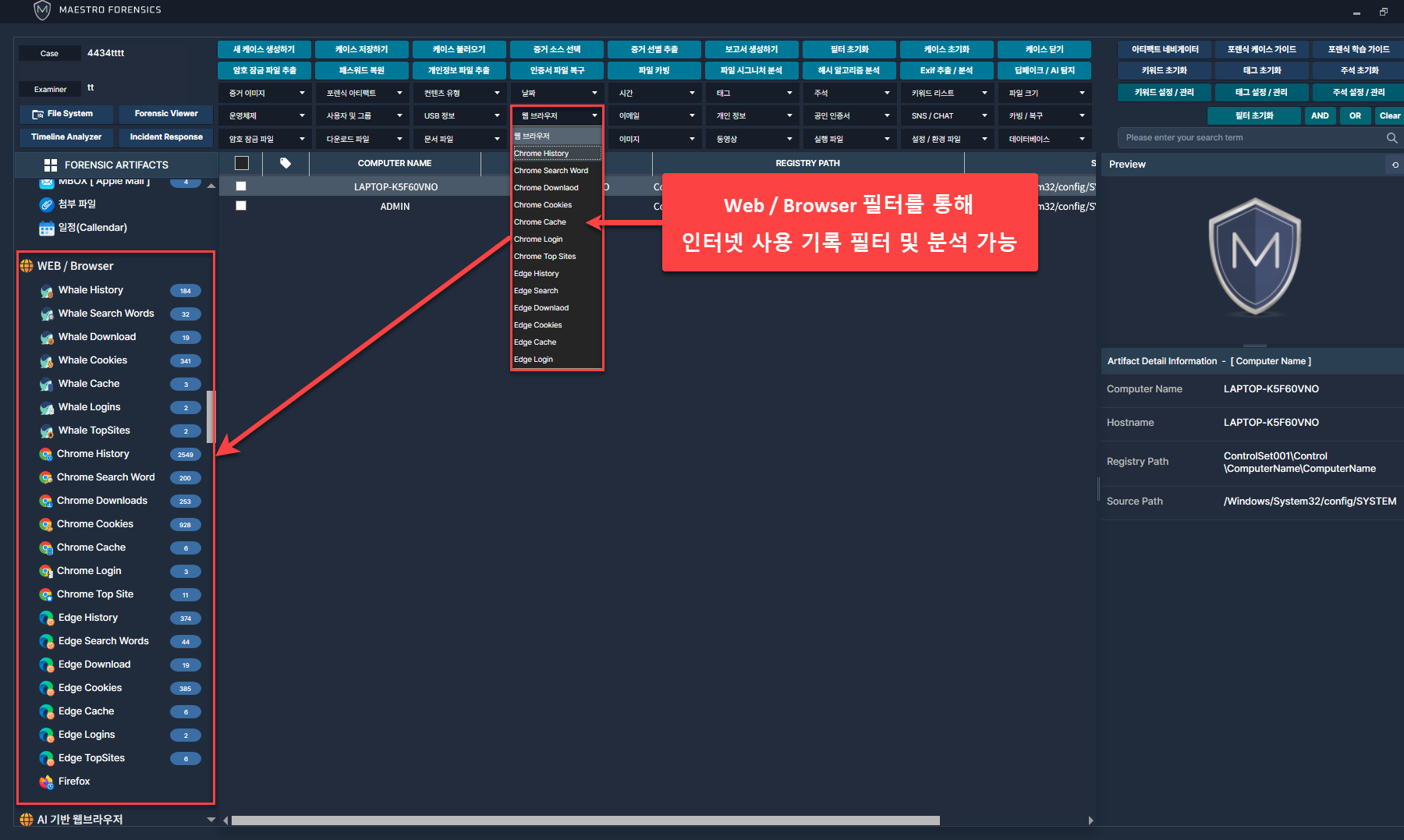 MAESTRO WiSDOM은 다양한 브라우저에서 웹사이트 방문기록, 다운로드 기록, 검색어 등 정보를 자동으로 추출.