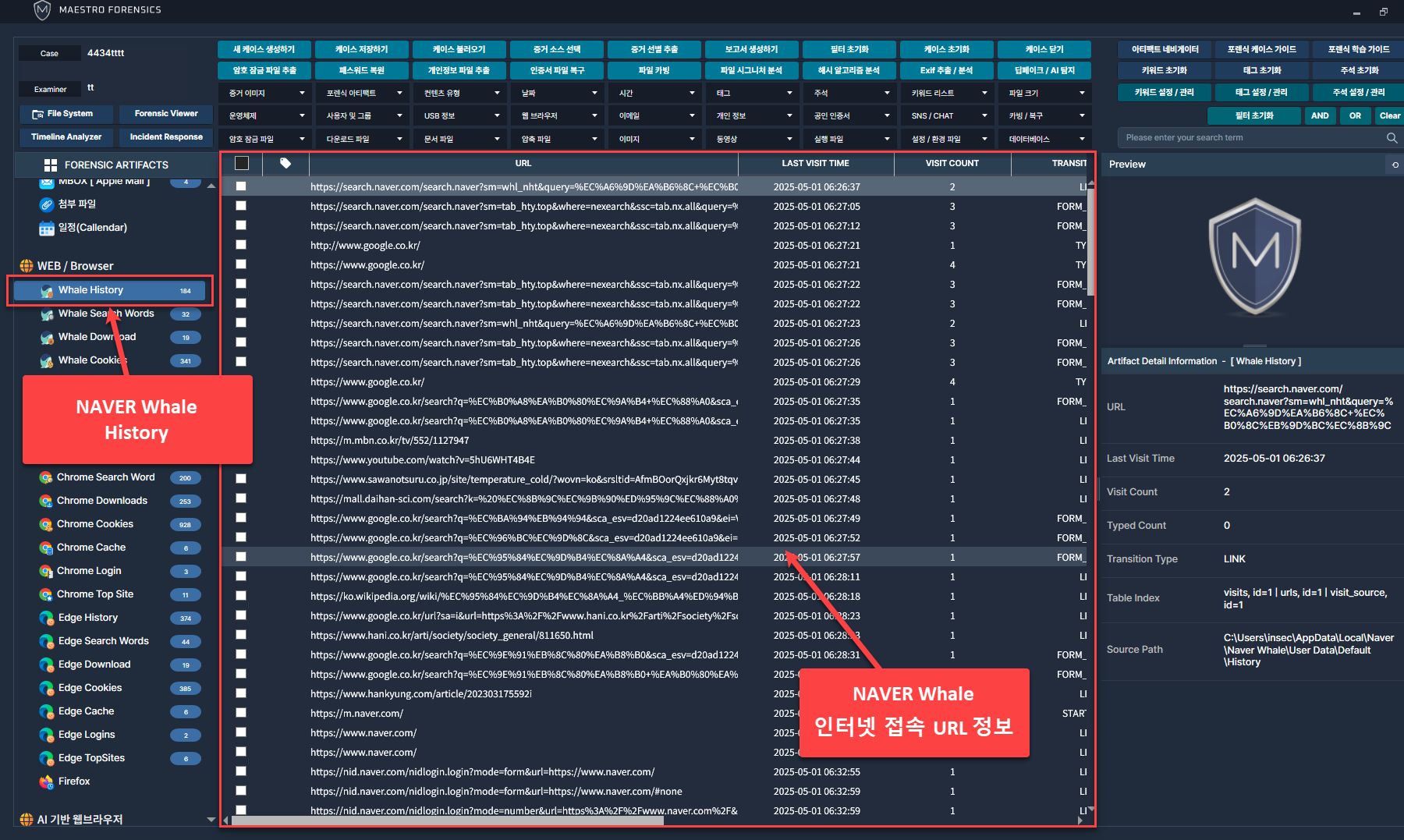 네이버 브라우저인 Whale의 인터넷 접속 기록을 손쉽게 분석 가능.