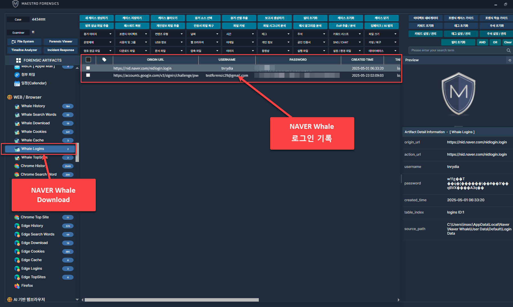 네이버 웨일 브라우저를 통해 웹사이트에 로그인한 사용자 계정 정보 분석 가능.