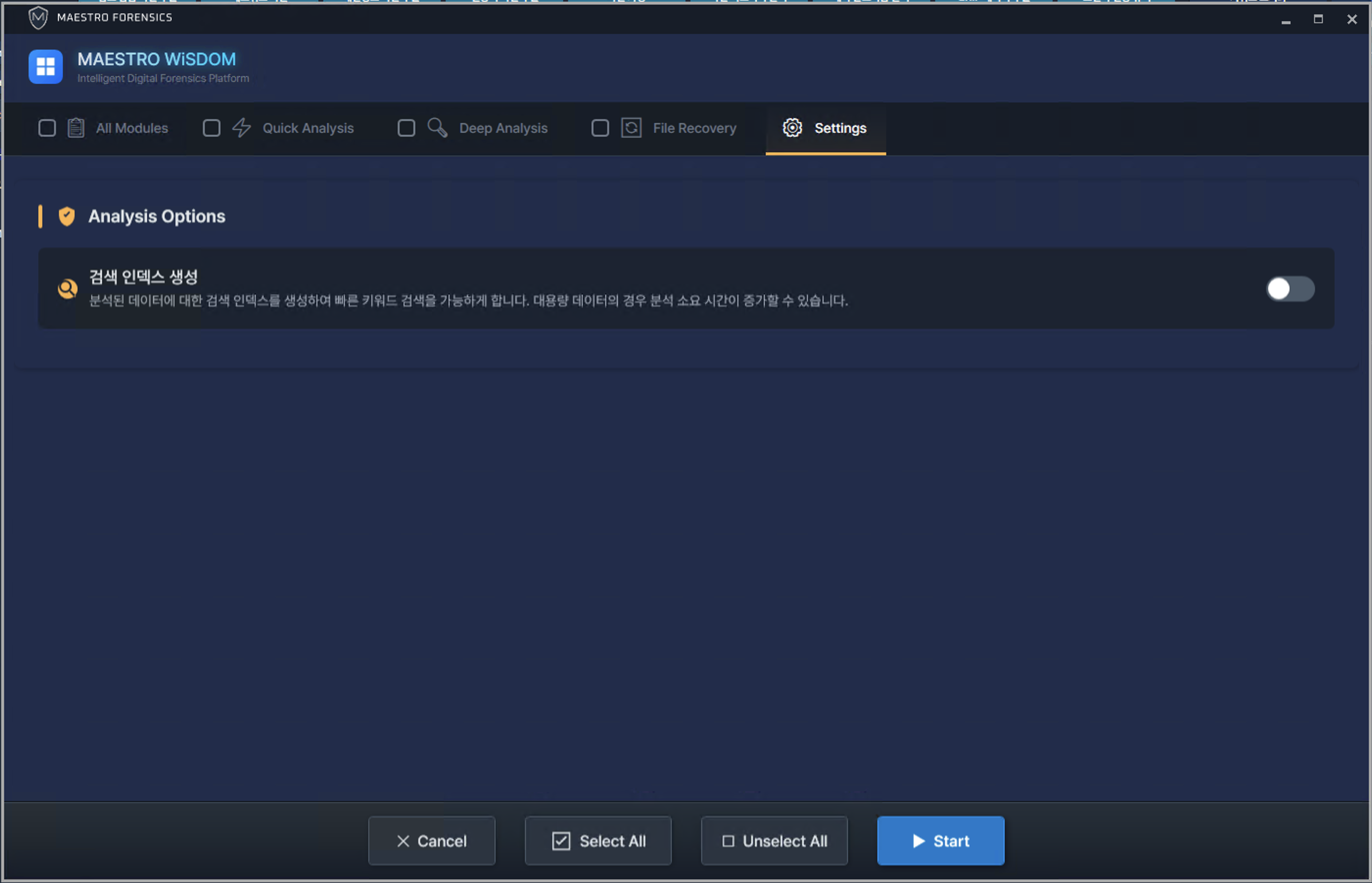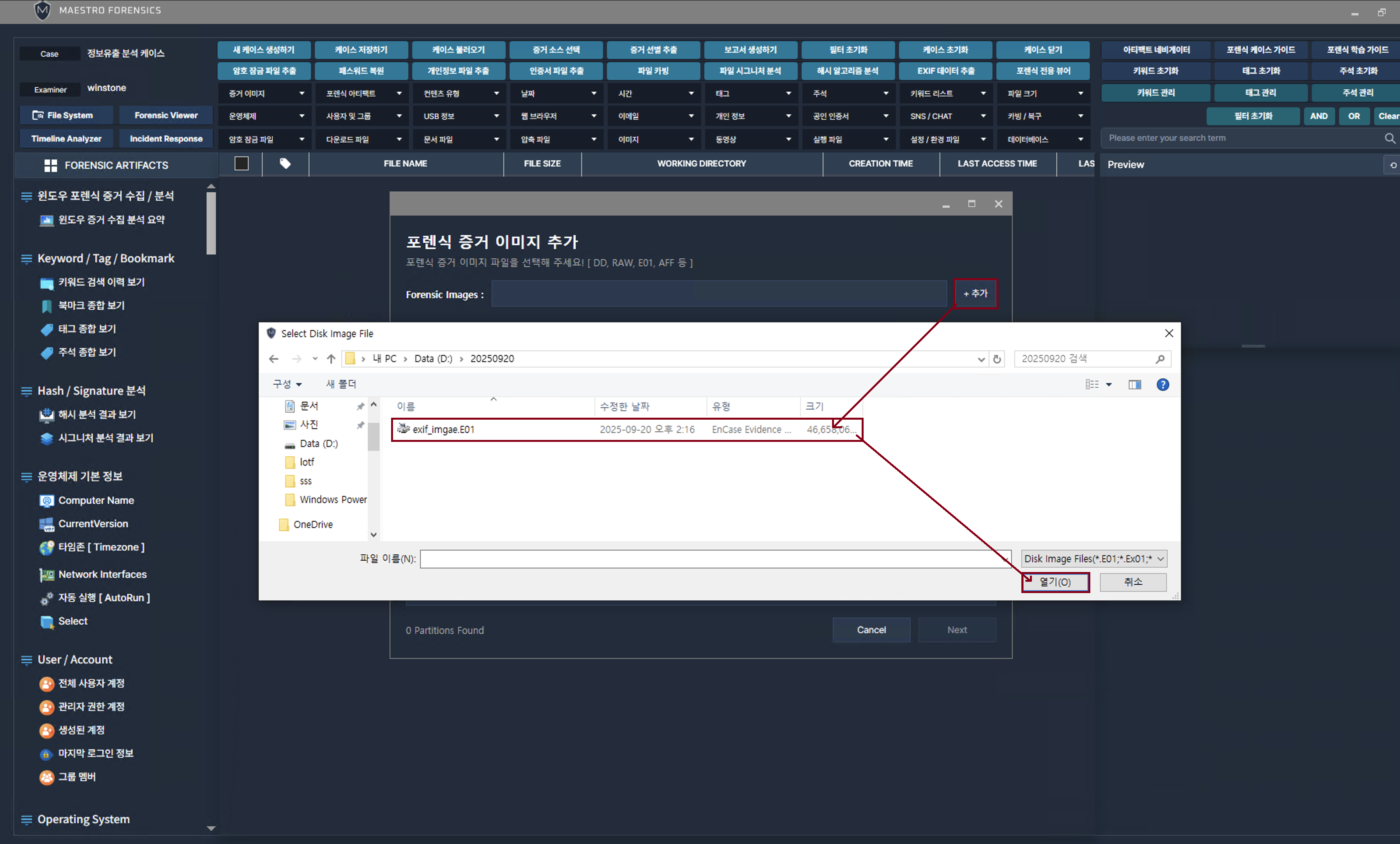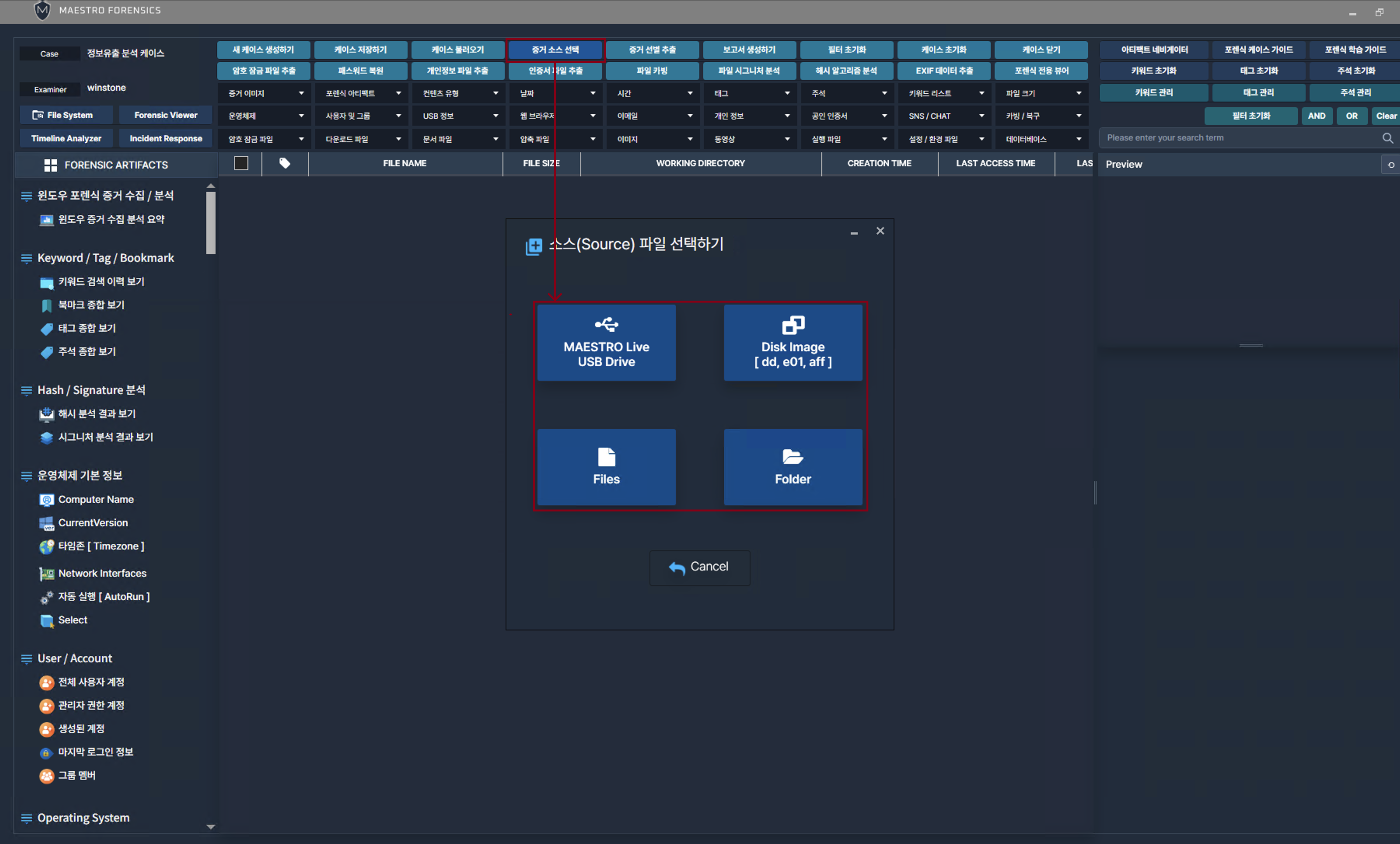 WiSDOM은 선별압수, 이미지파일, 파일, 폴더 불러오기 등 증거 소스 불러오기가 가능합니다.