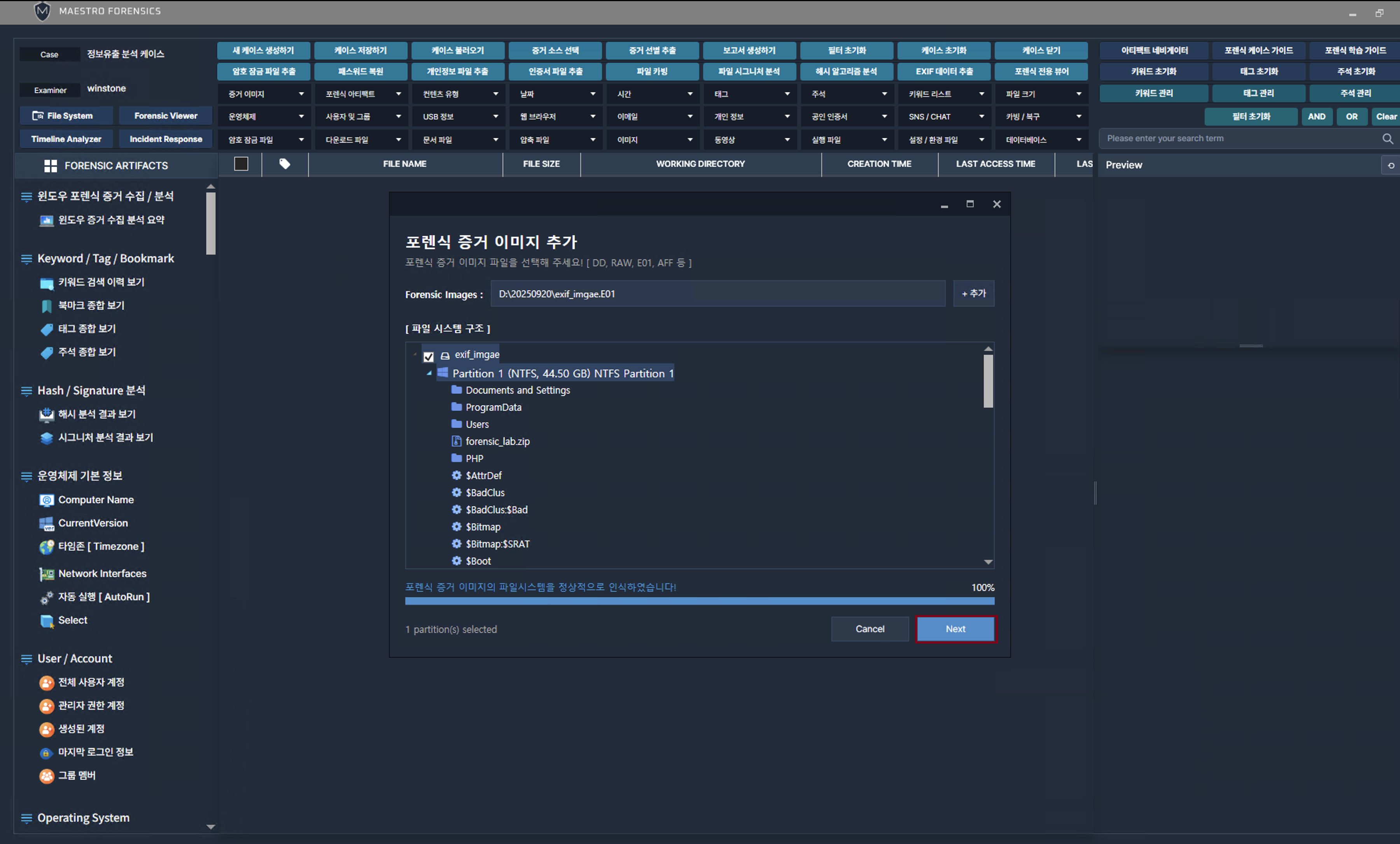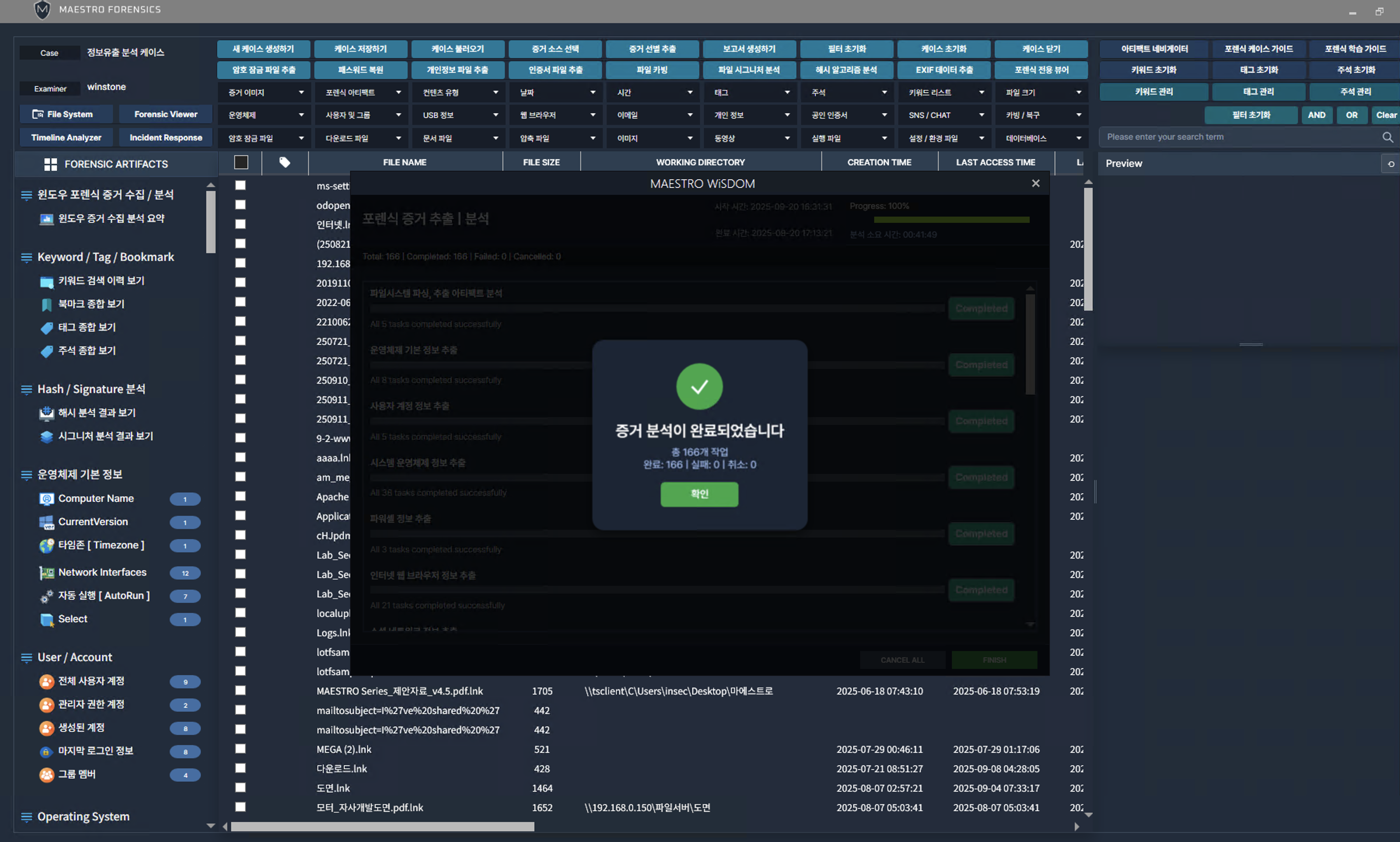 수집 완료된 아티팩트를 분석합니다.