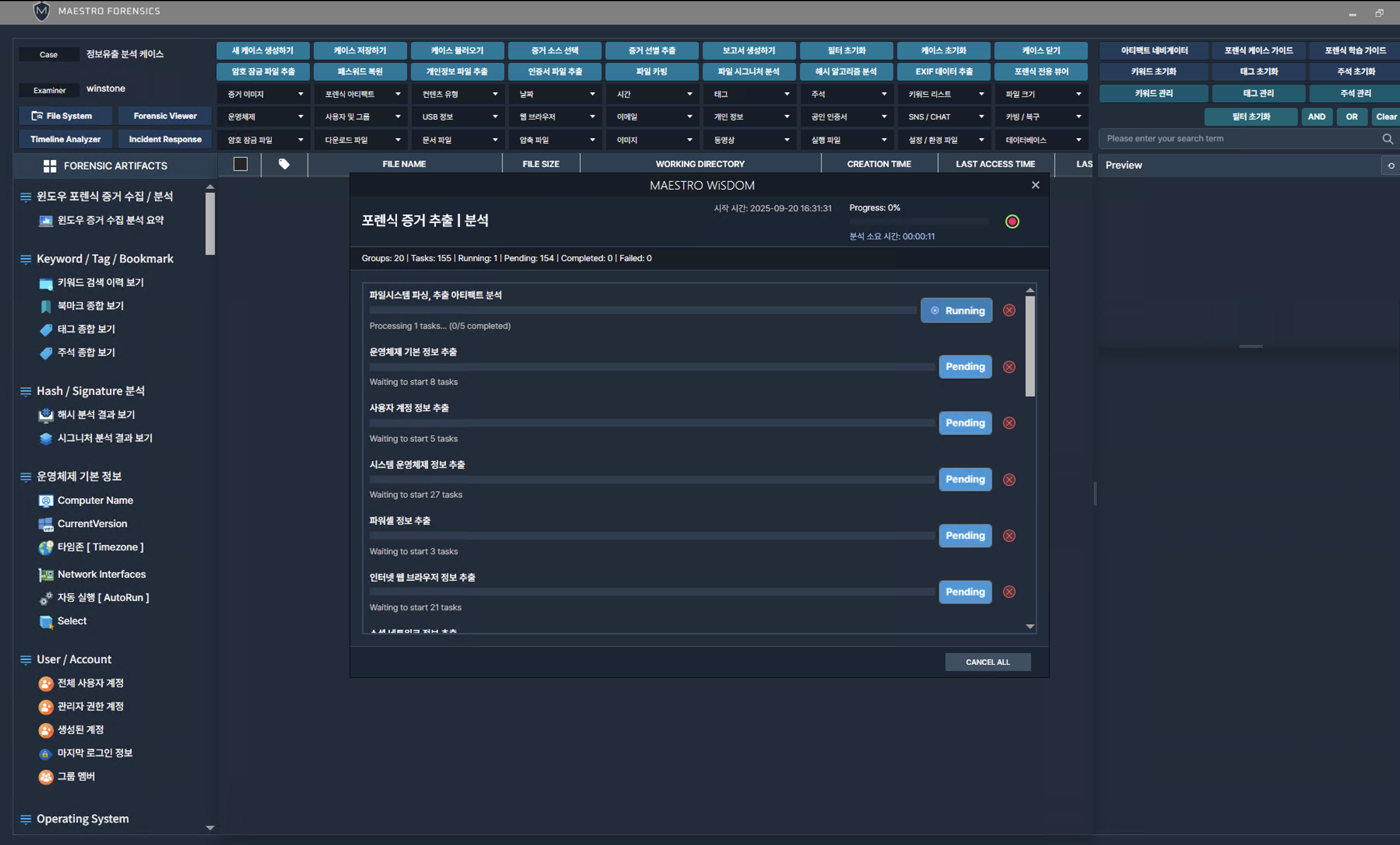 선택 한 Windows 아티팩트를 수집하는 진행창을 확인할 수 있습니다.