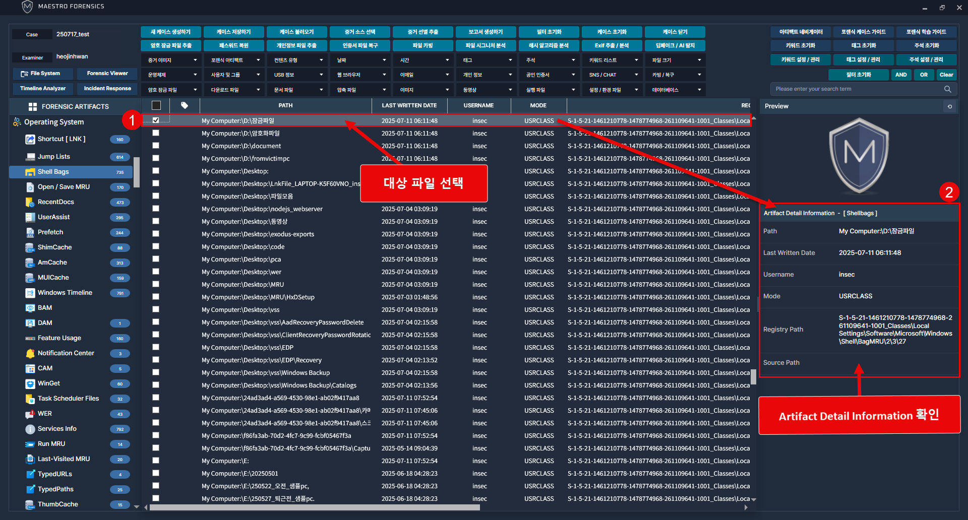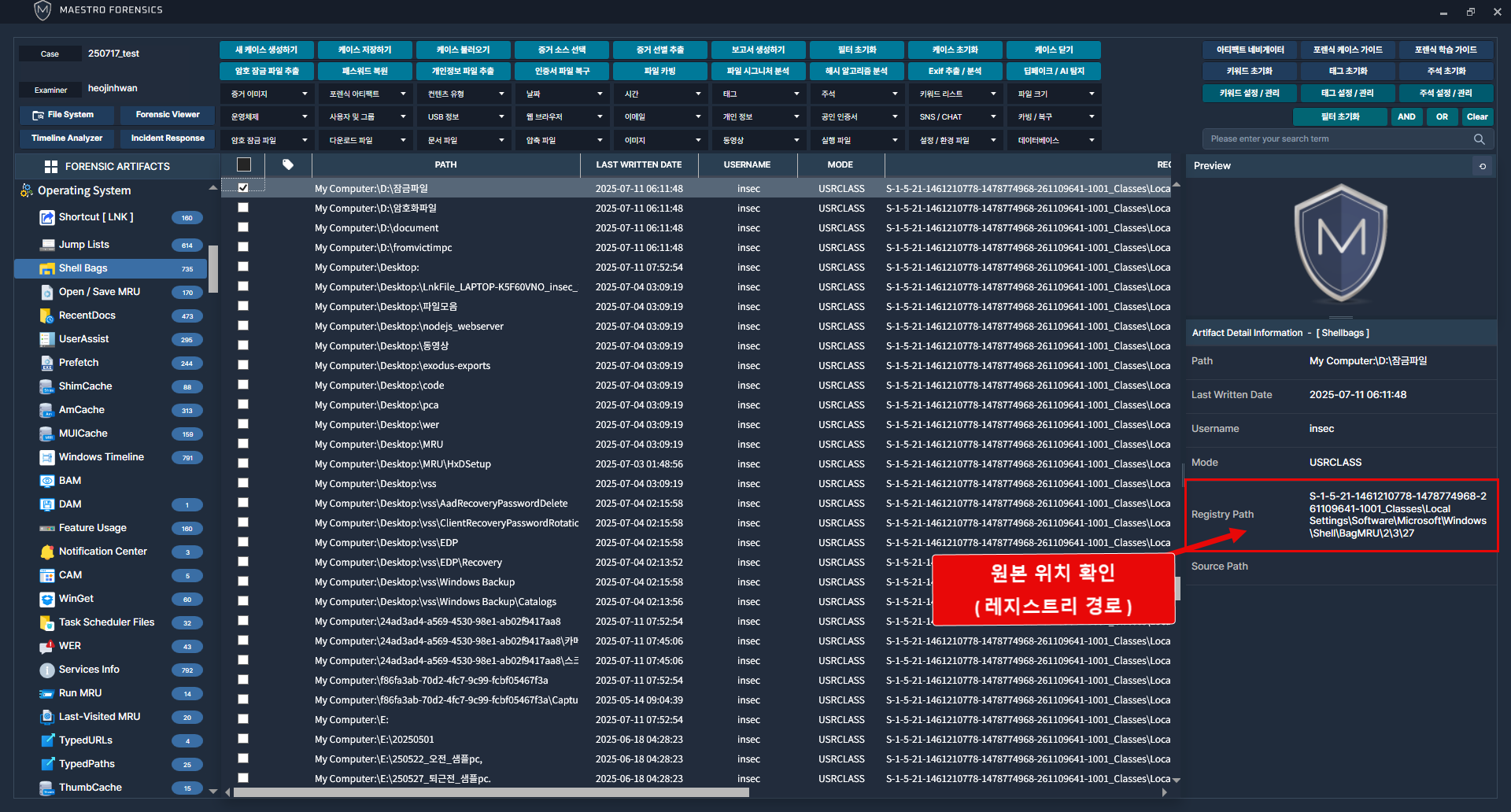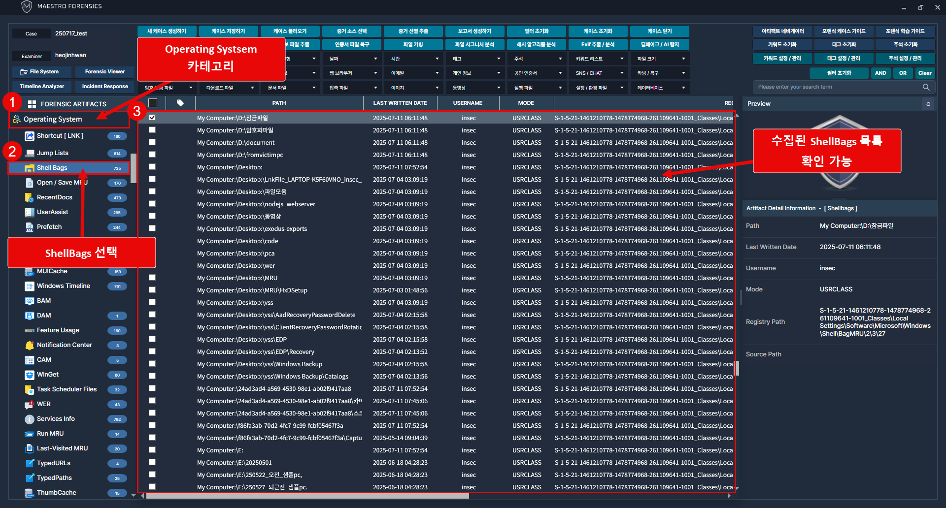 MAESTRO Wisdom을 통해 폴더 접근 기록을 분석하기 위해 [Operating System] 그룹의 [Shell Bags] 카테고리로 이동.