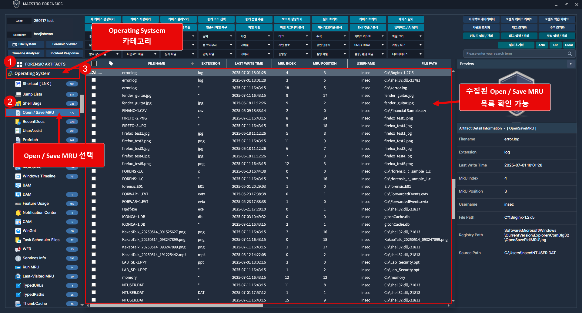 MAESTRO Wisdom을 통해 최근 실행/저장된 문서 아티팩트를 분석하기 위해 [Operating System] 그룹의 [Open/Save MRU] 카테고리로 이동.