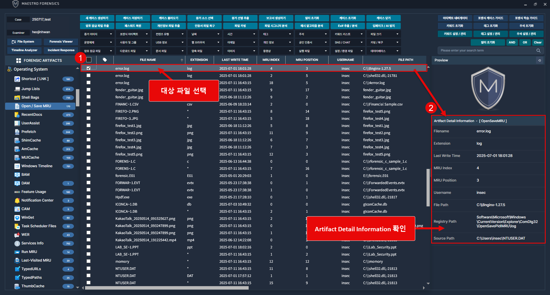 특정 <행> 클릭 후 [Artifacts Detail Information]창을 통해 메타데이터 정보 식별 가능.