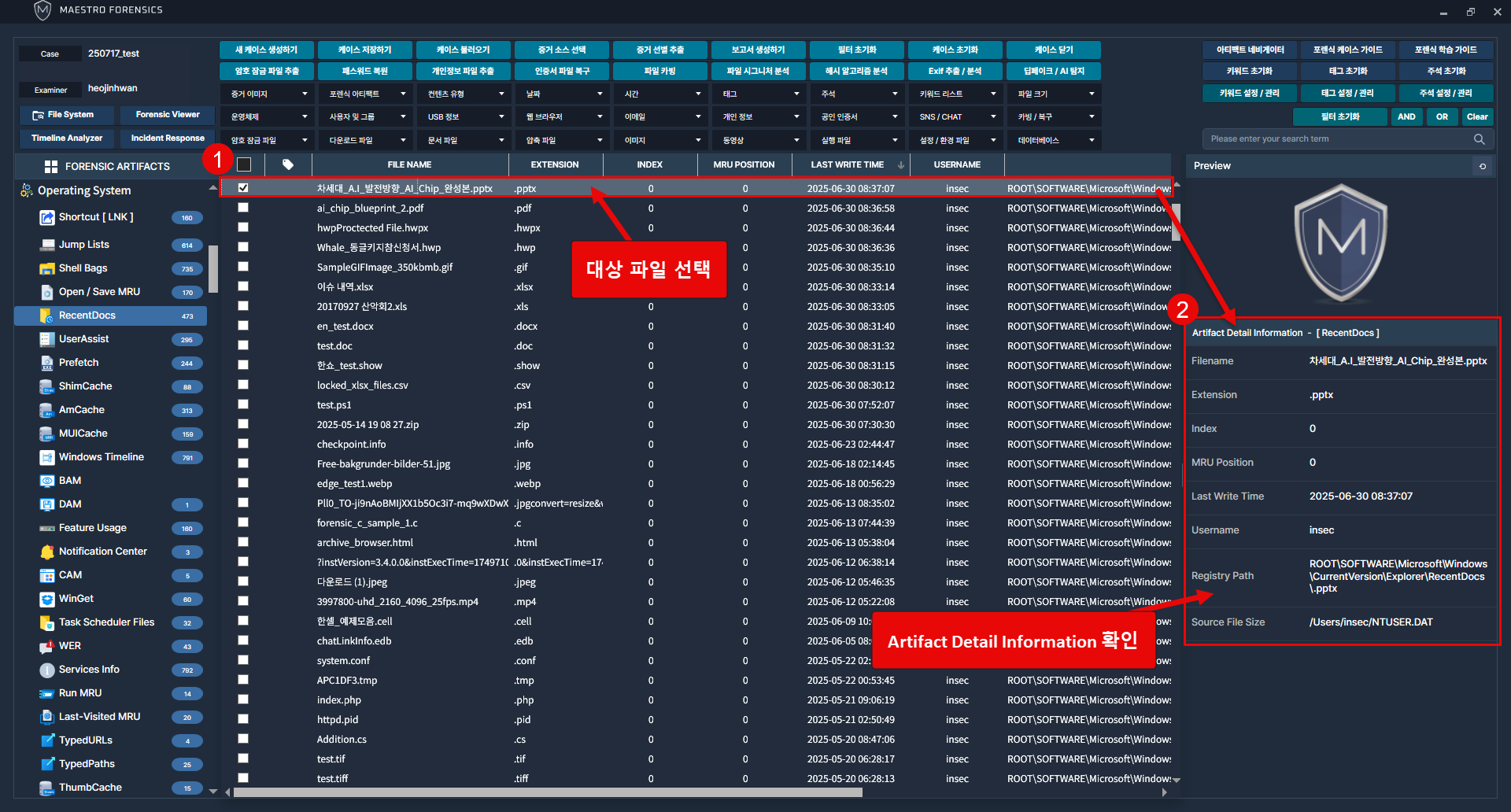 특정 <행> 클릭 후 [Artifacts Detail Information]창을 통해 메타데이터 정보 식별 가능.