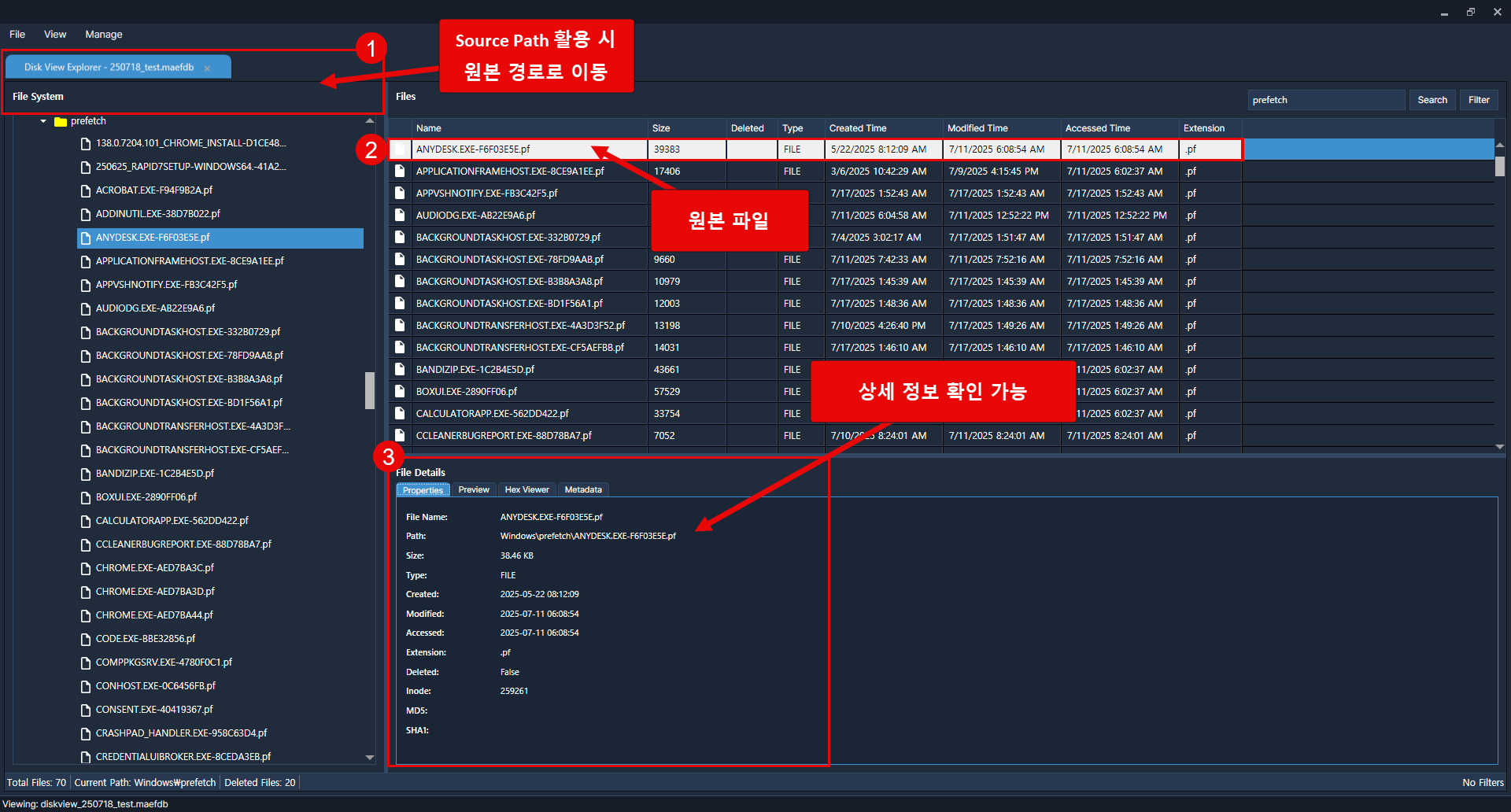 [파일 시스템 뷰어]에서 원본 파일 및 메타데이터 정보 확인 가능.