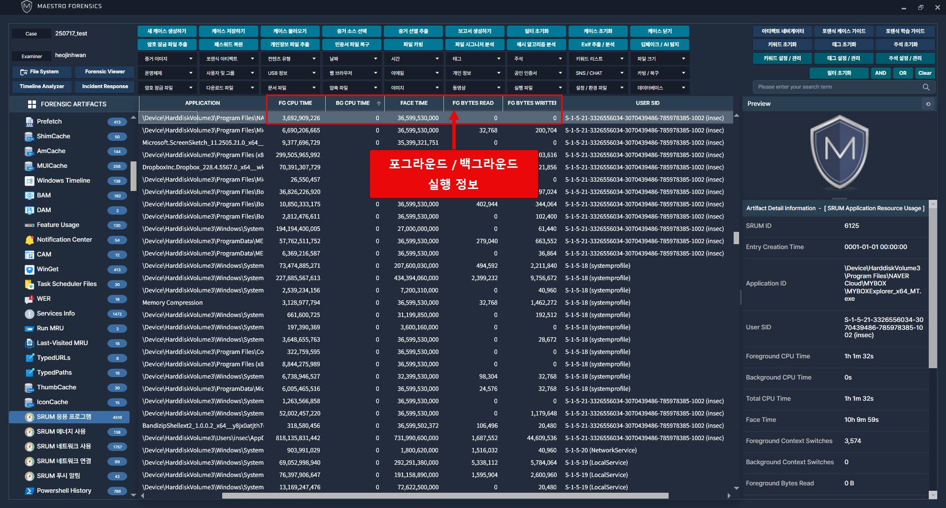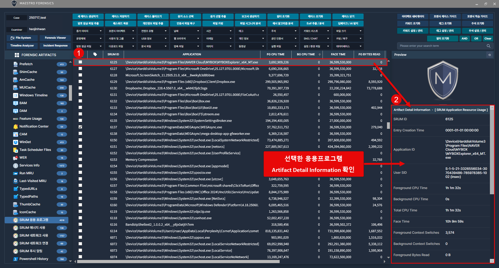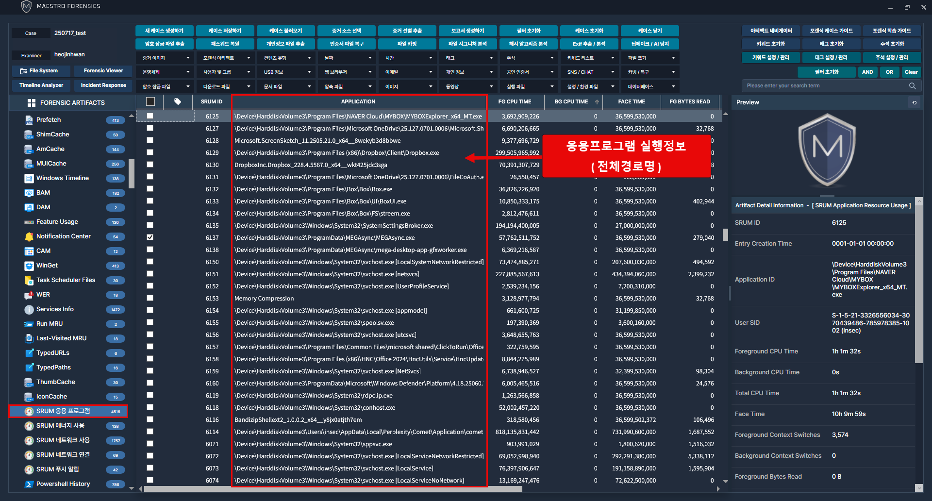 [SRUM 응용프로그램] 카테고리에서 응용프로그램 사용 흔적 확인가능. [Detail Information] 정보를 통해 직관적으로 응용프로그램 메타데이터 확인 가능