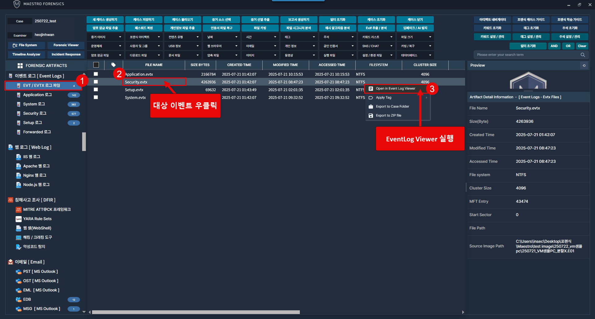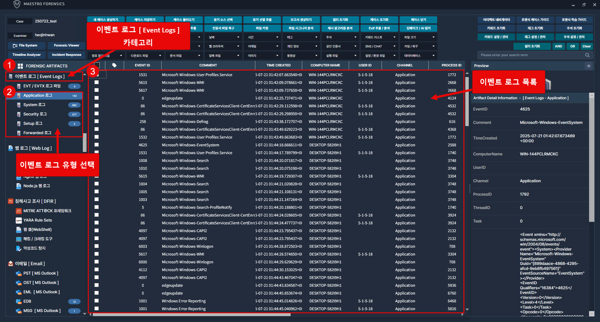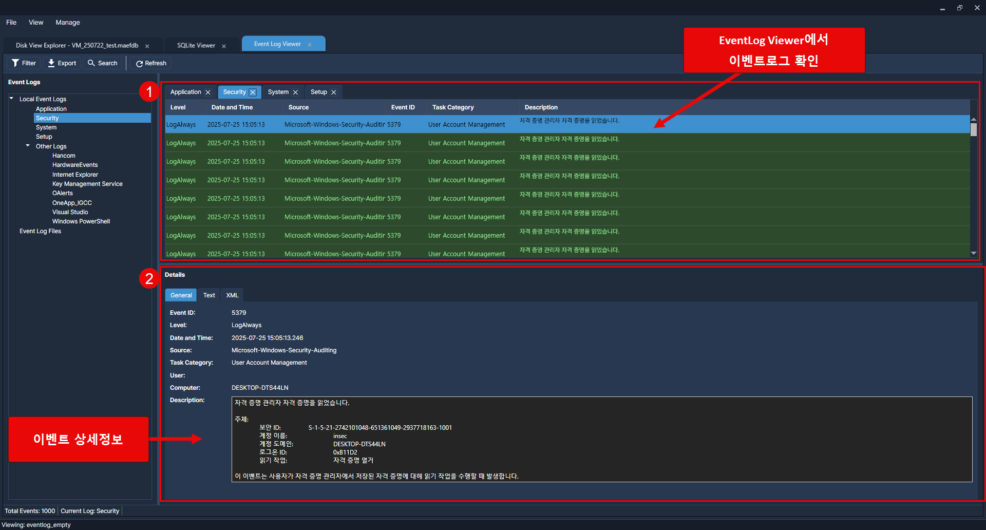전용 Eventlog Viewer를 통해 주요 이벤트 로그 분석 가능