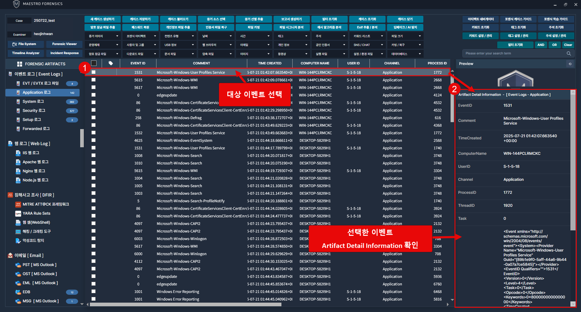 주요 이벤트 로그 항목의 정제된 정보를 데이터 그리드를 통해 분석할 수 있으며, Detail Information를 이용하여 주요 메타데이터 정보 분석 가능.